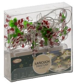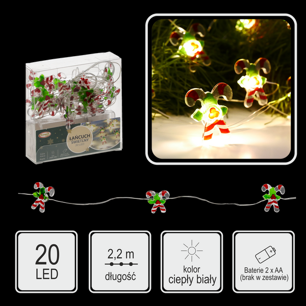 LED svetlobna veriga - bonboni 20 lučk, na baterije – Chomik, je idealna izbira za vse, ki želijo s preprosto dekoracijo ustvariti prijetno, svetlo in toplo atmosfero doma ali na dogodku. Z dolžino 2,2 m in 20 toplo belimi LED diodami ponuja ravno pravo mero svetlobe za poudarjanje detajlov ter ustvarjanje udobnega ambienta brez potrebe po električnem priključku.