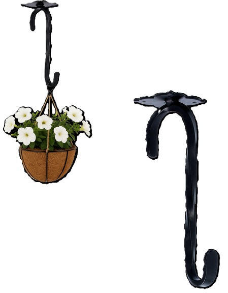 Črna barva kljuke za obešanje rastlin prinaša občutek elegance in preprostosti, ki se zlahka prilagodi vsakemu okolju. Minimalističen dizajn omogoča, da izdelek ne prevladuje nad dekoracijo, temveč jo dopolnjuje. Takšna kljuka je primerna za različne stile – od rustikalnih lesenih teras do modernih kovinskih konstrukcij. Zaradi nevtralne barvne zasnove se odlično ujema z najrazličnejšimi materiali, kot so les, kamen ali kovina, in tako prispeva k uravnoteženemu videzu prostora.
