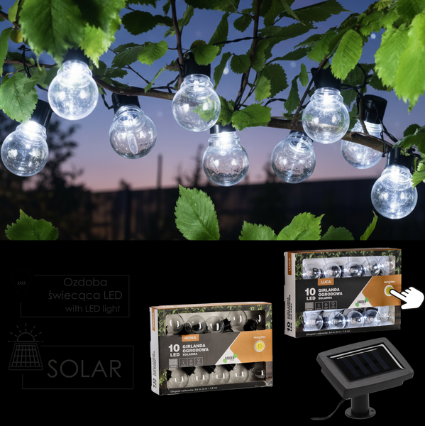Sončna vrtna girlanda Chomik SOL3590 se lepo ujema z različnimi stili zunanje opreme – od rustikalnega do modernega. Hladno bela svetloba poudari naravne teksture lesa, kovine ali kamna, zato je odličen dodatek k vrtni garnituri, pergoli ali vhodu. Zaradi preproste oblike in kompaktnih dimenzij je primerna tudi za sezonske dekoracije, na primer za praznične večere ali poletne zabave. Ko pade mrak, vsaka LED žarnica nežno zasveti in ustvari prijetno, a učinkovito osvetlitev, ki ne moti oči.