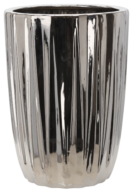 Keramični tulec za lonček v srebrni barvi je več kot zgolj dekorativni dodatek – je prefinjen element, ki s svojim bleščečim videzom in rebrasto teksturo v prostor vnese občutek razkošja in urejenosti. Površina tulca, oblikovana s subtilnimi vzdolžnimi rebrastimi črtami, ustvarja igro svetlobe in sence, ki se spreminja glede na kot pogleda in intenzivnost osvetlitve. Takšna dinamična struktura omogoča, da izdelek v interierju deluje kot osrednji estetski poudarek, hkrati pa se harmonično zlije z različnimi dekorativnimi slogi – od minimalizma do sodobnega glamurja.