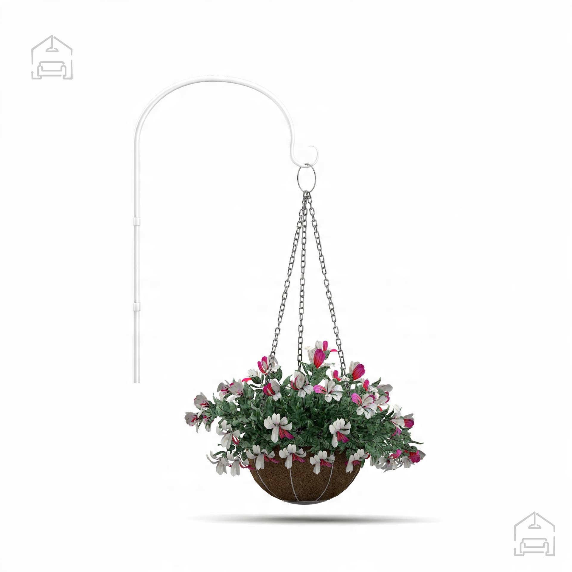 Namestitev viseče košare je preprosta in ne zahteva posebnega orodja. Kovinski okvir vsebuje nosilne elemente, ki omogočajo varno pritrditev na steno, ograjo ali pod strop. Košara je lahka, a hkrati dovolj stabilna, da prenese težo zemlje in rastlin. Zaradi polkrožne oblike je mogoče obešanje tudi ob steno, kar prihrani prostor in hkrati ustvari vizualno zanimivo dekoracijo.