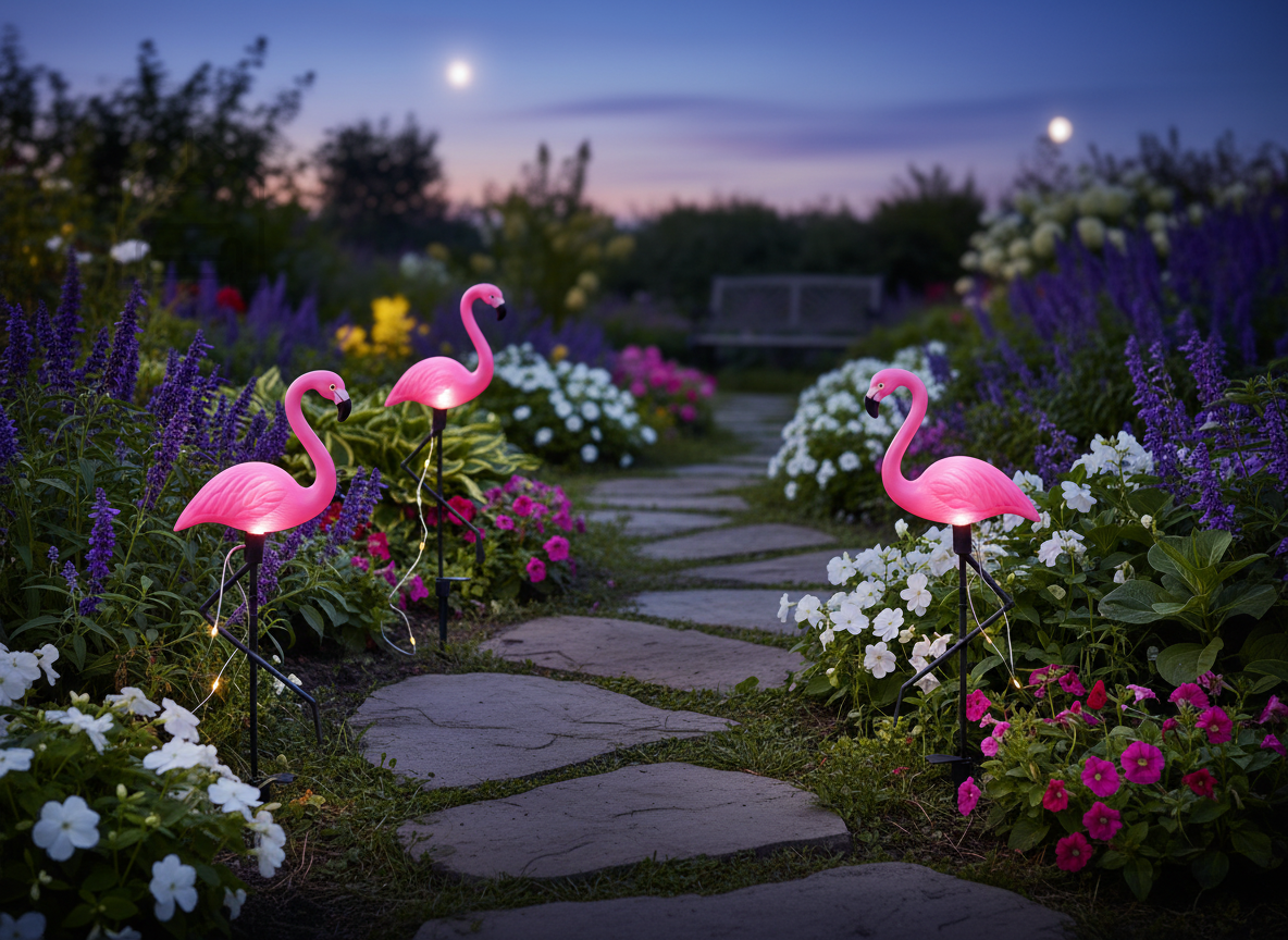 Oblika flaminga je simbol elegance, veselja in eksotičnega pridiha. Postavite jih ob bazen, v cvetlični gredici ali ob vrtno pot, in takoj boste ustvarili igrivo, a prefinjeno atmosfero. Hladno bela svetloba nežno poudari obliko ptic in rastlin okoli njih, kar daje vrtu čarobno podobo. Podnevi so flamingi zanimiva dekoracija, ponoči pa nežno svetlobno doživetje, ki očara goste in ustvari prijetno vzdušje za sproščene večere na prostem.