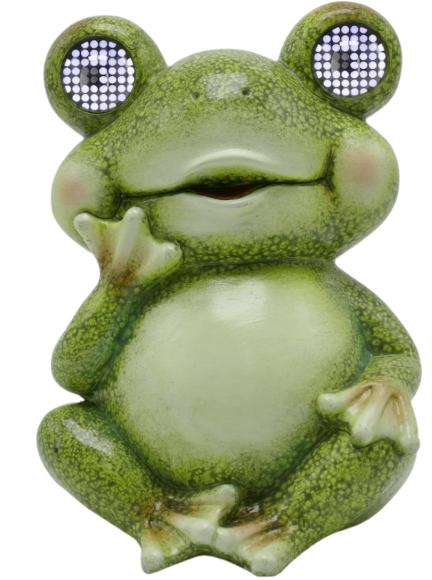 Izdelek je izdelan iz kakovostnih, vremensko odpornih materialov, ki zagotavljajo dolgo življenjsko dobo tudi ob izpostavljenosti soncu, dežju ali mrazu. Površina je obdelana tako, da posnema naravno teksturo kože žabe, kar figurici daje realističen in prijeten videz. LED osvetlitev v očeh ustvarja topel, prijeten sijaj, ki nežno poudari obliko figurice, ne da bi bil moteč. Sistem deluje na baterije, kar omogoča preprosto postavitev kjerkoli v zunanjem prostoru, brez potrebe po električnih priključkih.