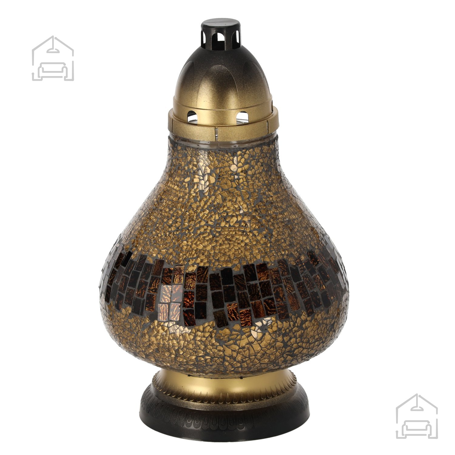 Izdelek je zasnovan za okrasitev nagrobnikov, vendar se zaradi estetske univerzalnosti odlično poda tudi v notranje ambiente, kot so dnevni prostori, predsobe ali terase. Zaradi stabilne karafe in zaščitnega ohišja je sveča primerna za uporabo na prostem, kjer je odporna na veter in vremenske vplive. Njena zlata barva simbolizira toplino, spomin in spoštovanje, hkrati pa se lepo ujema z različnimi materiali – od kamna in kovine do lesa in stekla.