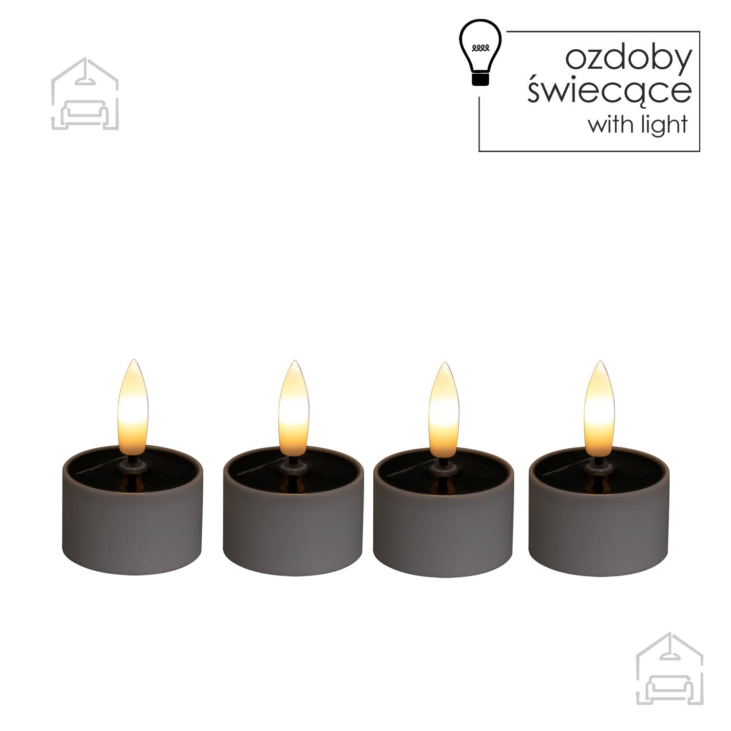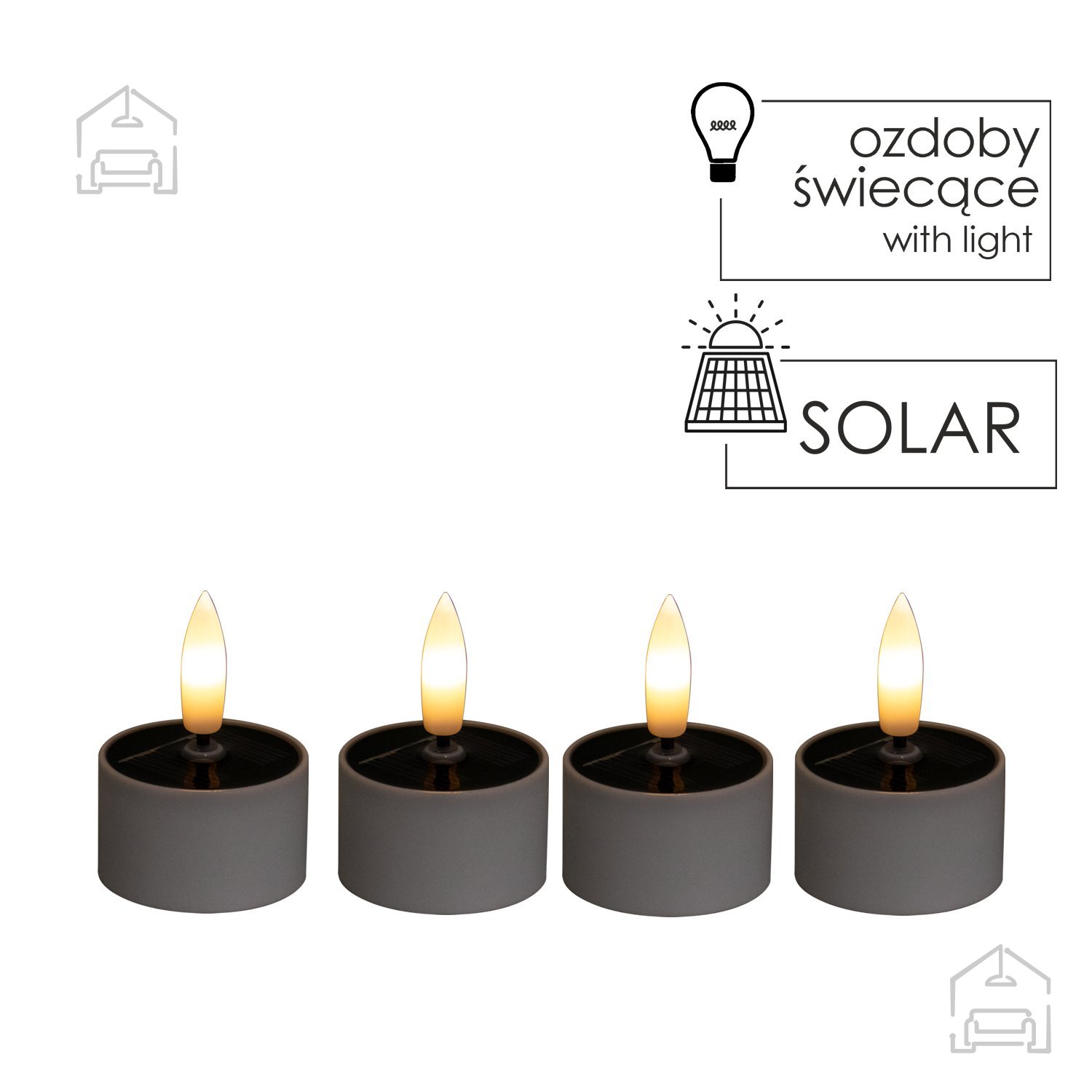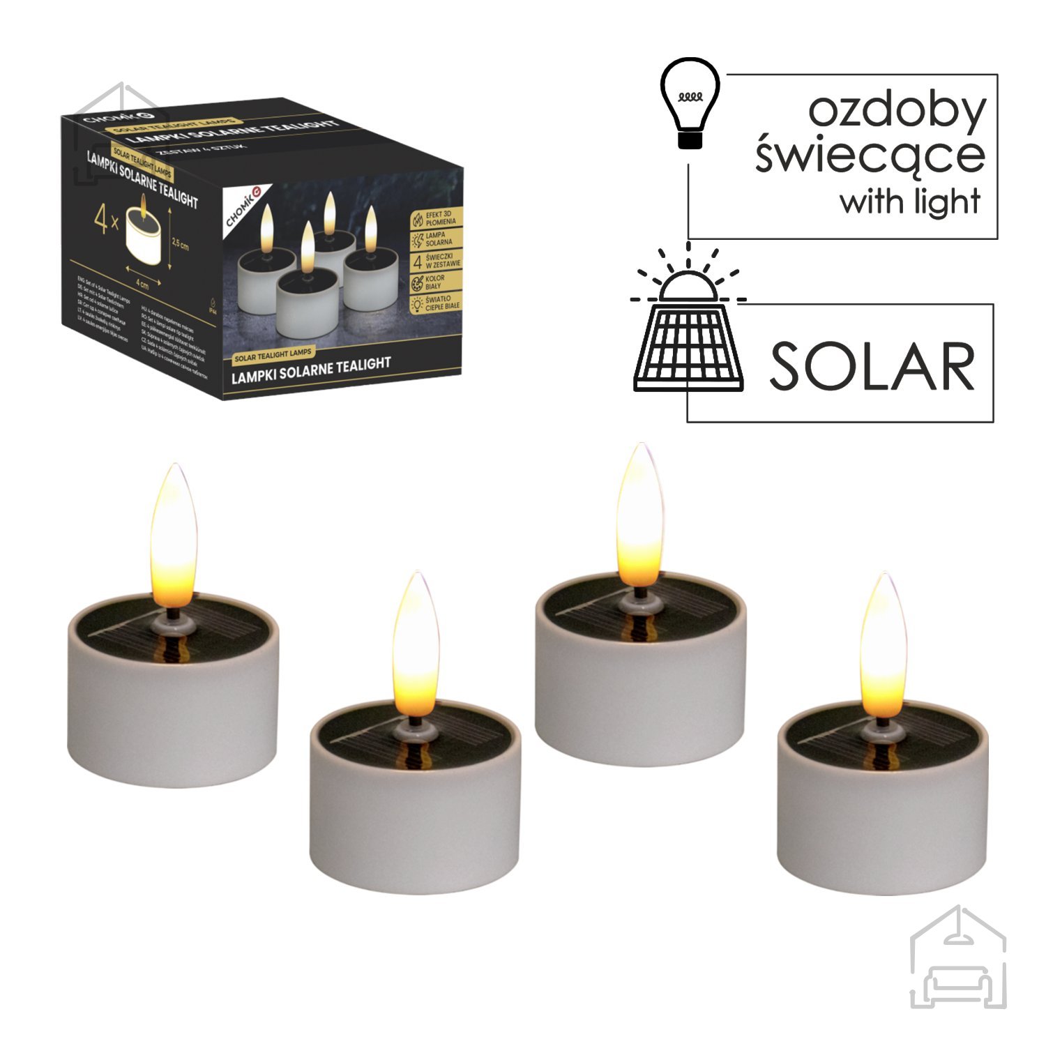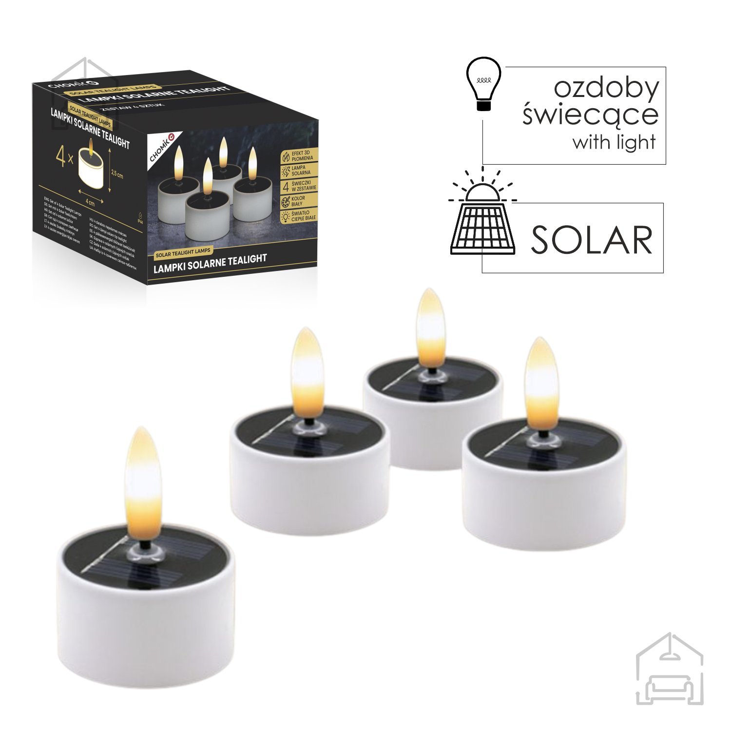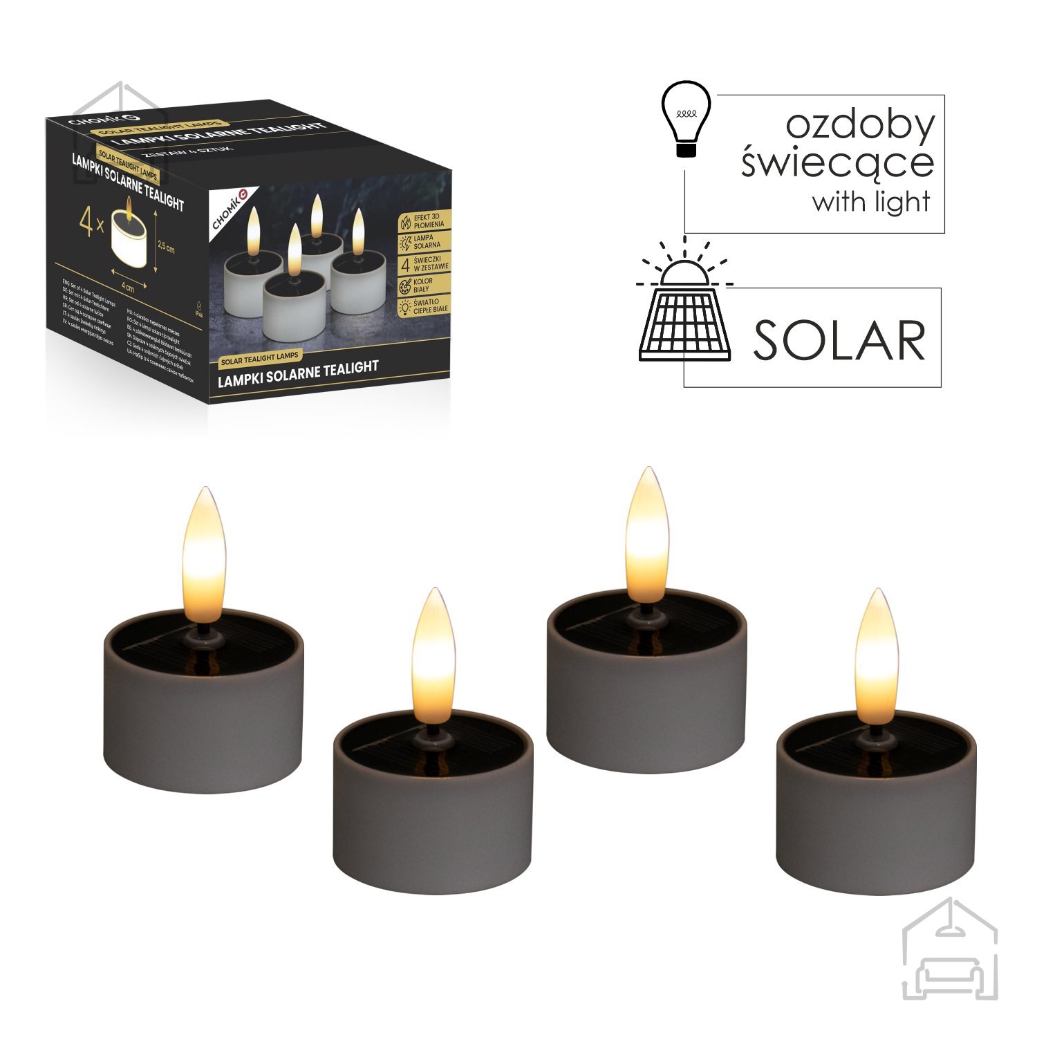 Komplet 4 solarnih svetilk Tealight – Chomik prinaša prijetno in varčno osvetlitev, ki združuje toplino svetlobe z estetsko preprostostjo. Vsaka svetilka v kompletu meri 4×2,5 cm in je izdelana iz kakovostne plastike, ki omogoča uporabo tako v notranjih kot zunanjih prostorih. Zahvaljujoč sončni energiji delujejo brez kablov in baterij, kar pomeni, da so popolnoma energetsko varčne in prijazne do okolja. Utripajoč 3D plamen z učinkom tople bele svetlobe ustvarja videz prave sveče, vendar brez nevarnosti odprtega ognja.