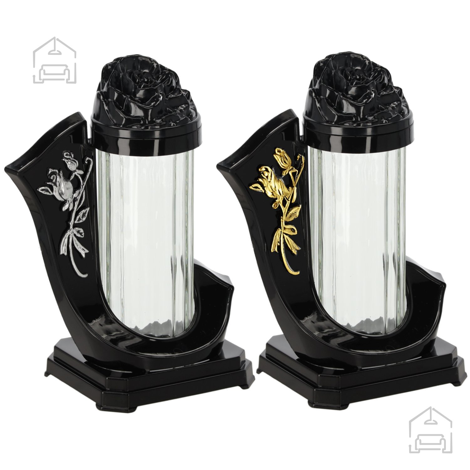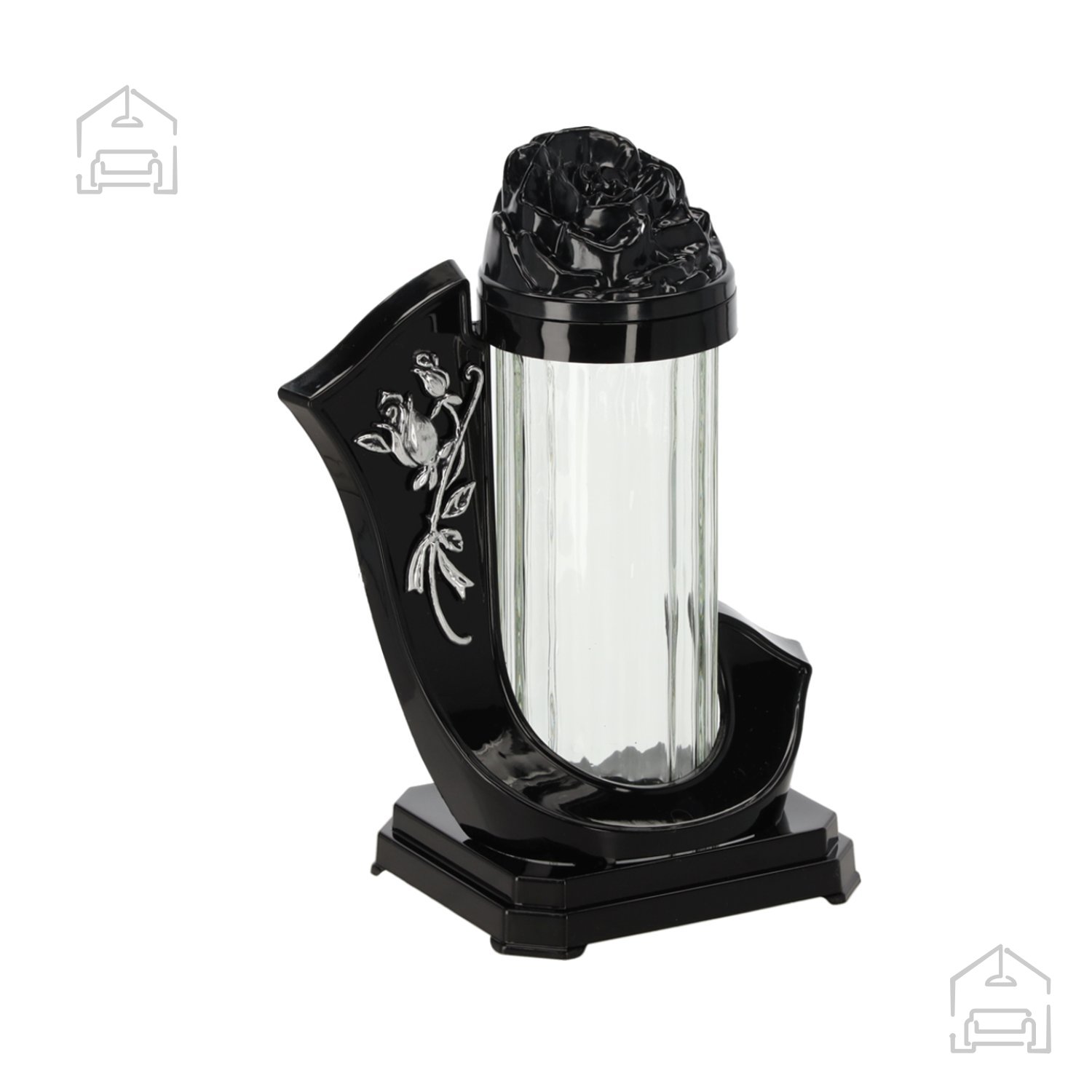 Motiv traku in vrtnice je klasičen simbol spoštovanja, spomina in večnosti. Ta kombinacija daje lampionu poseben pomen, zaradi katerega se lepo ujema z različnimi vrstami spominskih aranžmajev. Barvna izbira med črno-srebrno in črno-zlato varianto omogoča prilagajanje estetskemu videzu obstoječih nagrobnih okrasitev ali drugih elementov spominskega prostora. Sijajni kovinski poudarki ustvarjajo diskreten kontrast in dodajo občutek globine ter nežne svetlobne igre ob naravni ali svečani svetlobi.