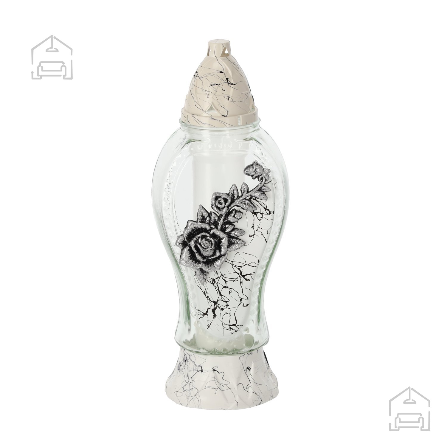 Motiv vrtnice ima v spominski kulturi poseben pomen, saj simbolizira ljubezen, spoštovanje in večnost. V kombinaciji z marmoriranim vzorcem ustvarja sveča prefinjen videz, ki se lepo zlije z okolico groba. Belo-srebrna barva deluje umirjeno in čisto, kar poudari občutek spoštovanja in miru. Sveča L1750 ni zgolj vir svetlobe, temveč tudi izraz osebnega spomina in skrbi za izgled spominskega prostora.