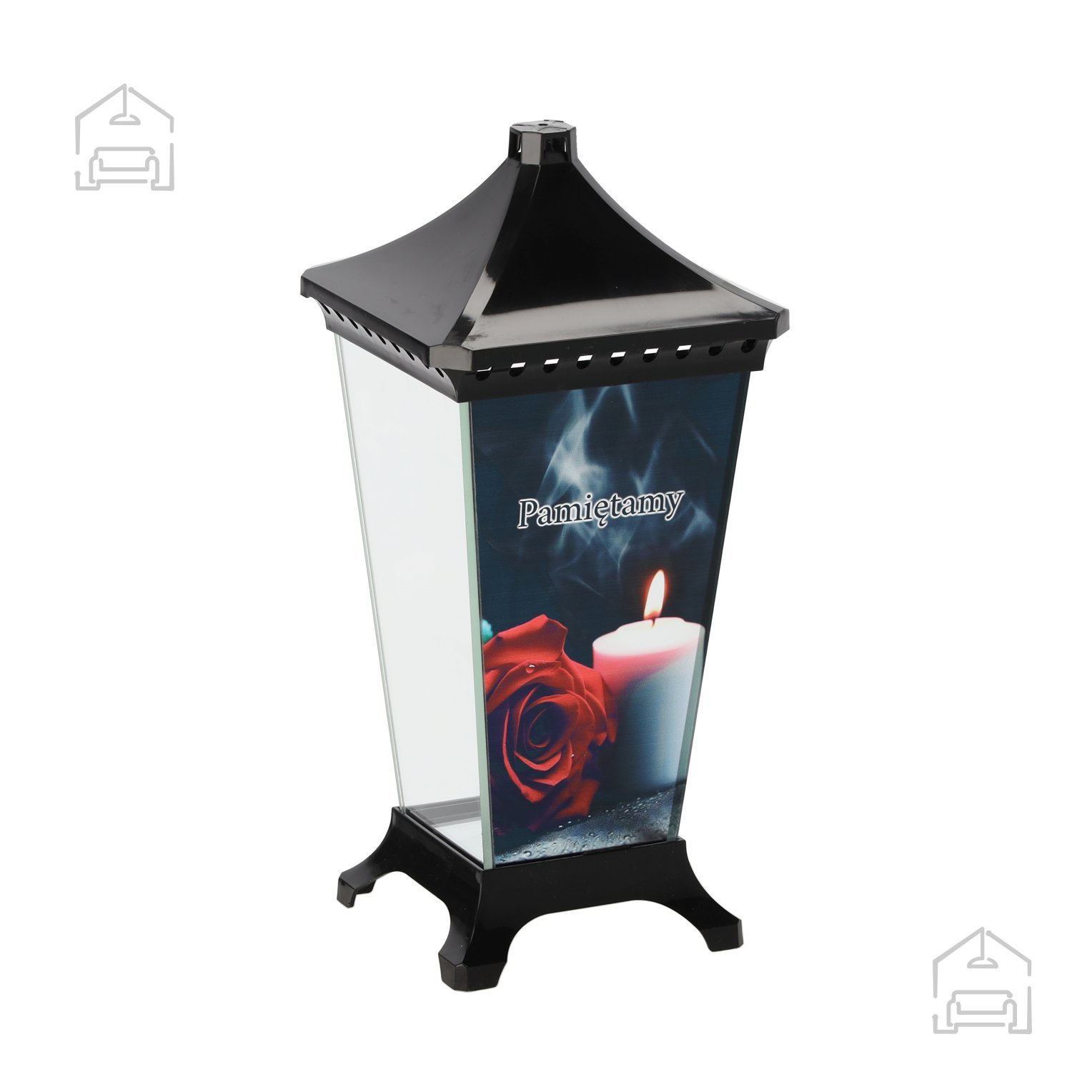 Izdelek je namenjen okrasitvi nagrobnikov ter drugim spominskim mestom, kjer želimo poudariti spoštovanje do pokojnih. Lahko se uporablja samostojno ali kot del večjega aranžmaja s cvetjem, svečami ali drugimi simbolnimi dodatki. Zaradi klasične oblike se lepo ujema z različnimi materiali – od kamna in kovine do stekla – ter omogoča estetsko skladno postavitev. Lampion oddaja mehko svetlobo, ki ustvarja občutek miru in tišine ob večernih urah ali v času spominskih dni.