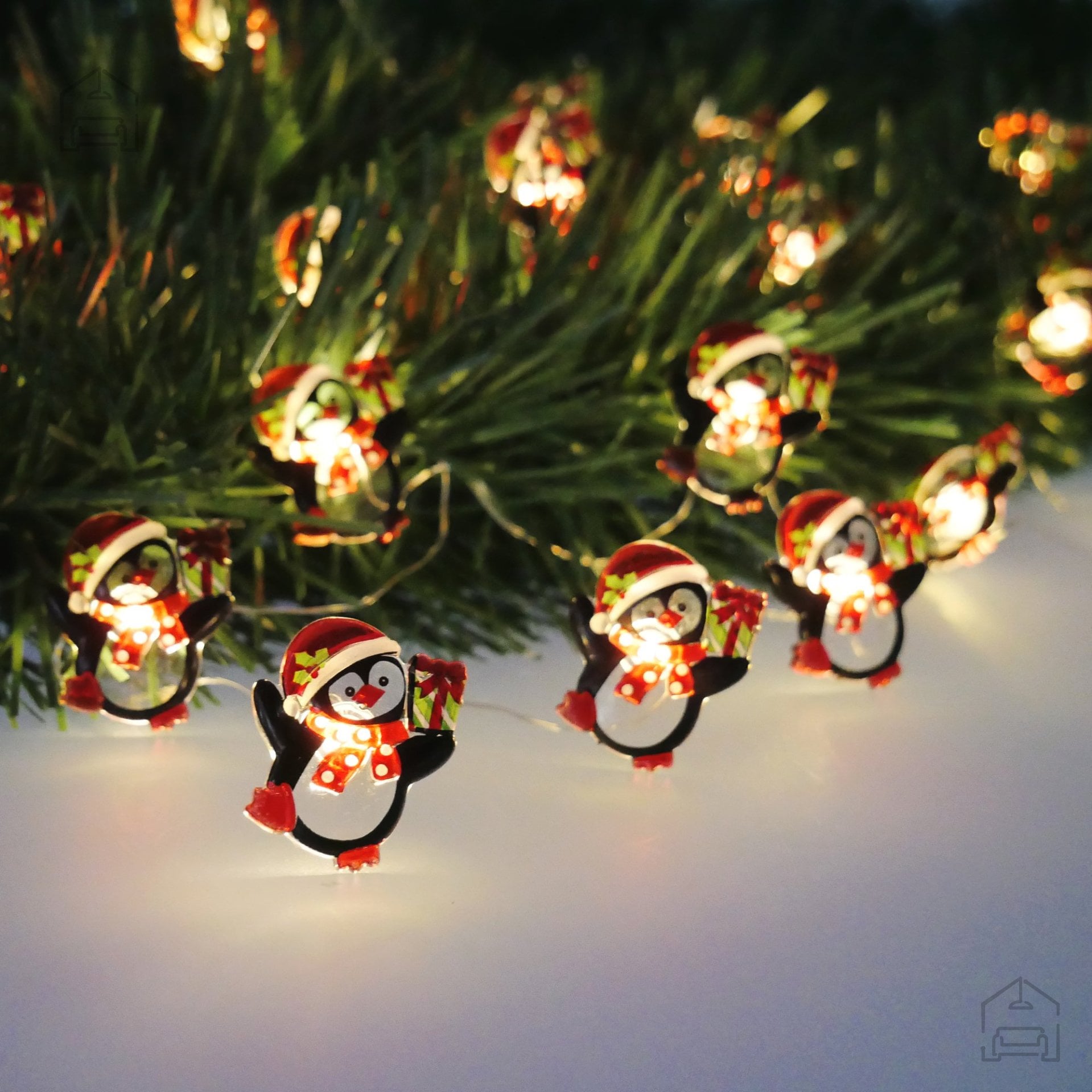 Vsak posamezen element verige je okrašen s figurico pingvina, kar v prostor vnese občutek razigranosti in svežine. Kombinacija večbarvnega ohišja in tople bele svetlobe ustvarja prijeten kontrast, ki posebej lepo pride do izraza ob večerih ali v zatemnjenih prostorih. Zaradi subtilnega sijaja je svetlobna veriga primerna tudi kot nežna nočna osvetlitev v otroški sobi ali kot dekorativni poudarek na praznični mizi.