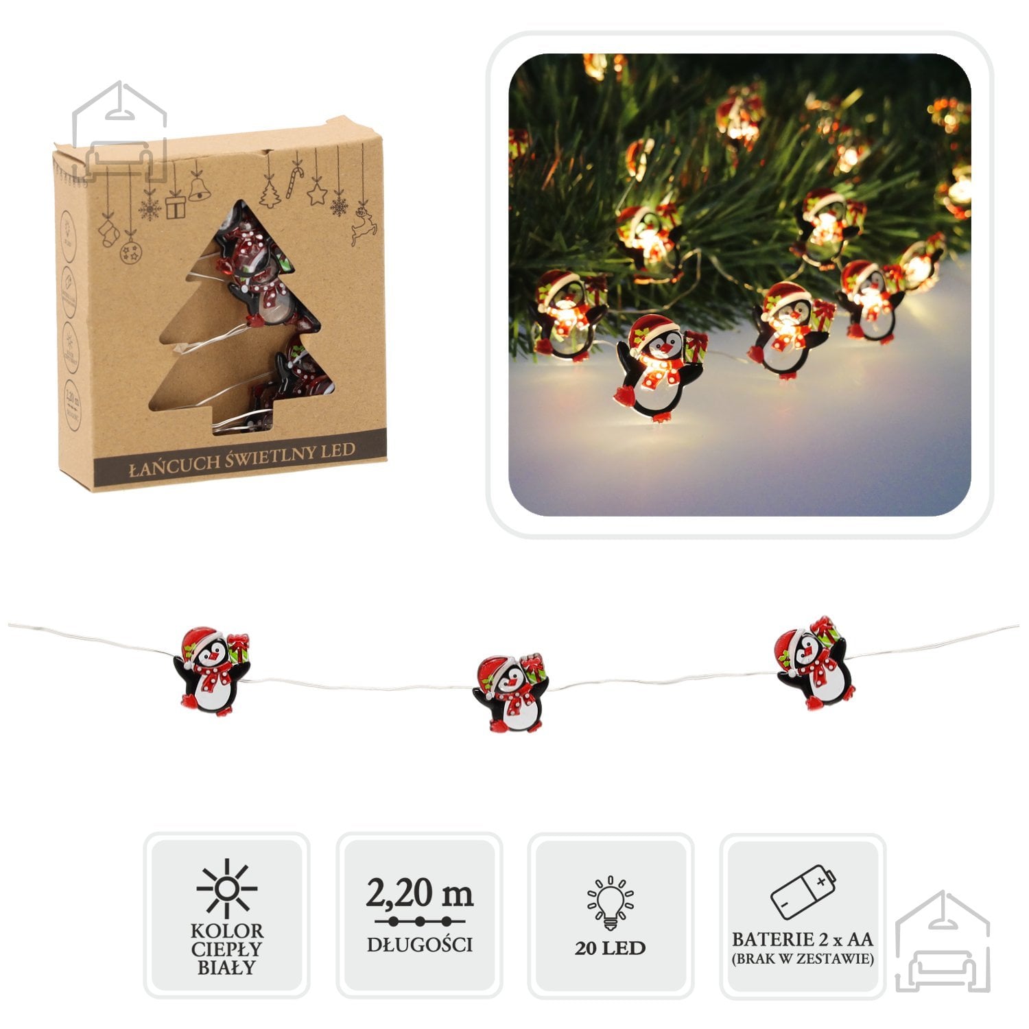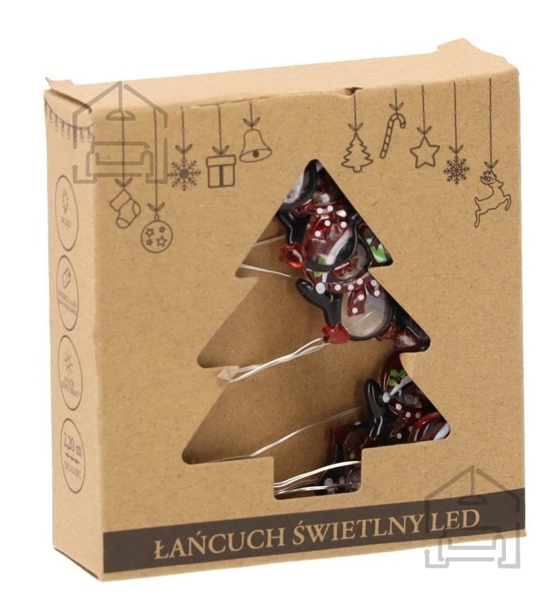 LED svetlobna veriga Pingvini – Chomik prinaša igriv in prijeten pridih zimskega čara v vsak dom. Zasnovana je s 20 toplo belimi LED lučkami, ki so razporejene v razmiku 10 cm in ustvarjajo mehko, vabljivo svetlobo. Okrašena je z majhnimi pingvini v večbarvni izvedbi, kar jo naredi idealno za praznično dekoracijo, otroške sobe ali kot sezonski poudarek v dnevnem prostoru. Zaradi napajanja na baterije (2×AA, baterije niso priložene) ni potrebna priključitev na električno omrežje, kar omogoča popolno svobodo pri postavitvi – od police do okenske police ali celo božičnega drevesa.