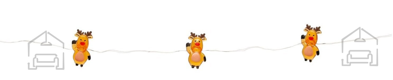 LED svetlobna veriga Jelenčk je popolna izbira za popestritev domačega okolja med prazniki ali kadar želite ustvariti posebno vzdušje. Zaradi večbarvnega dizajna jelenčkov in tople bele svetlobe veriga lepo dopolni lesene, kovinske in druge dekorativne elemente. Dolžina verige znaša 2,2 m, dodatnih 20 cm pa predstavlja vodilni kabel, kar omogoča enostavno namestitev na police, okenske okvirje, mize ali stenske dekoracije. Razdalja med posameznimi LED diodami je 10 cm, kar daje svetlobi uravnotežen razpored in prijeten vizualni učinek.