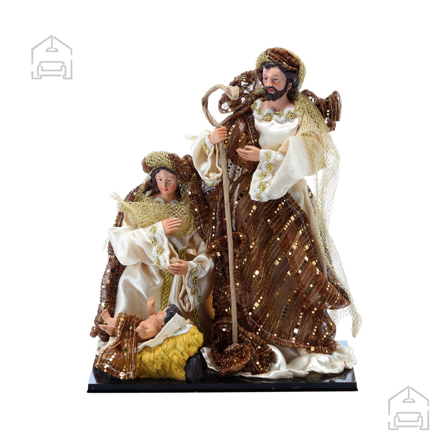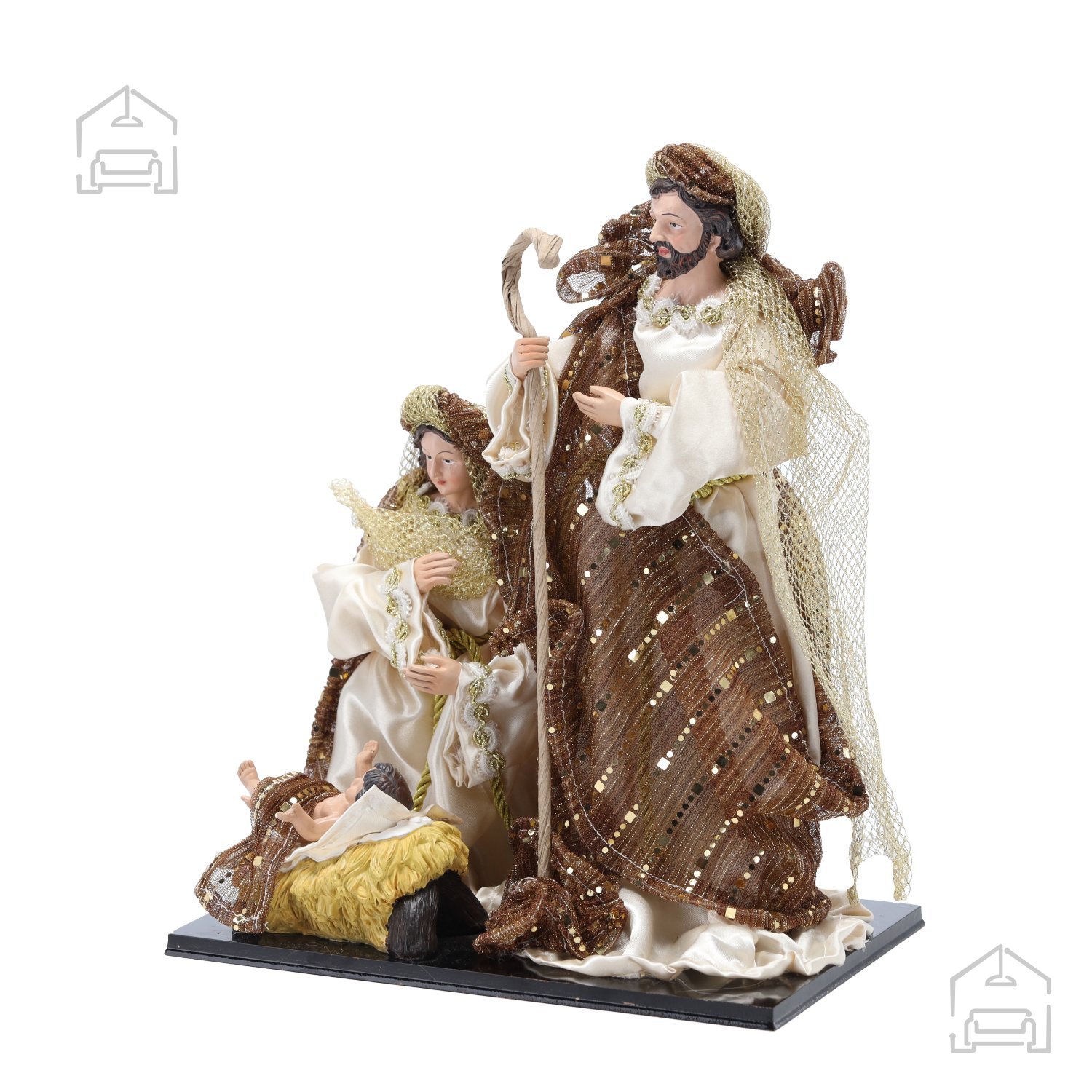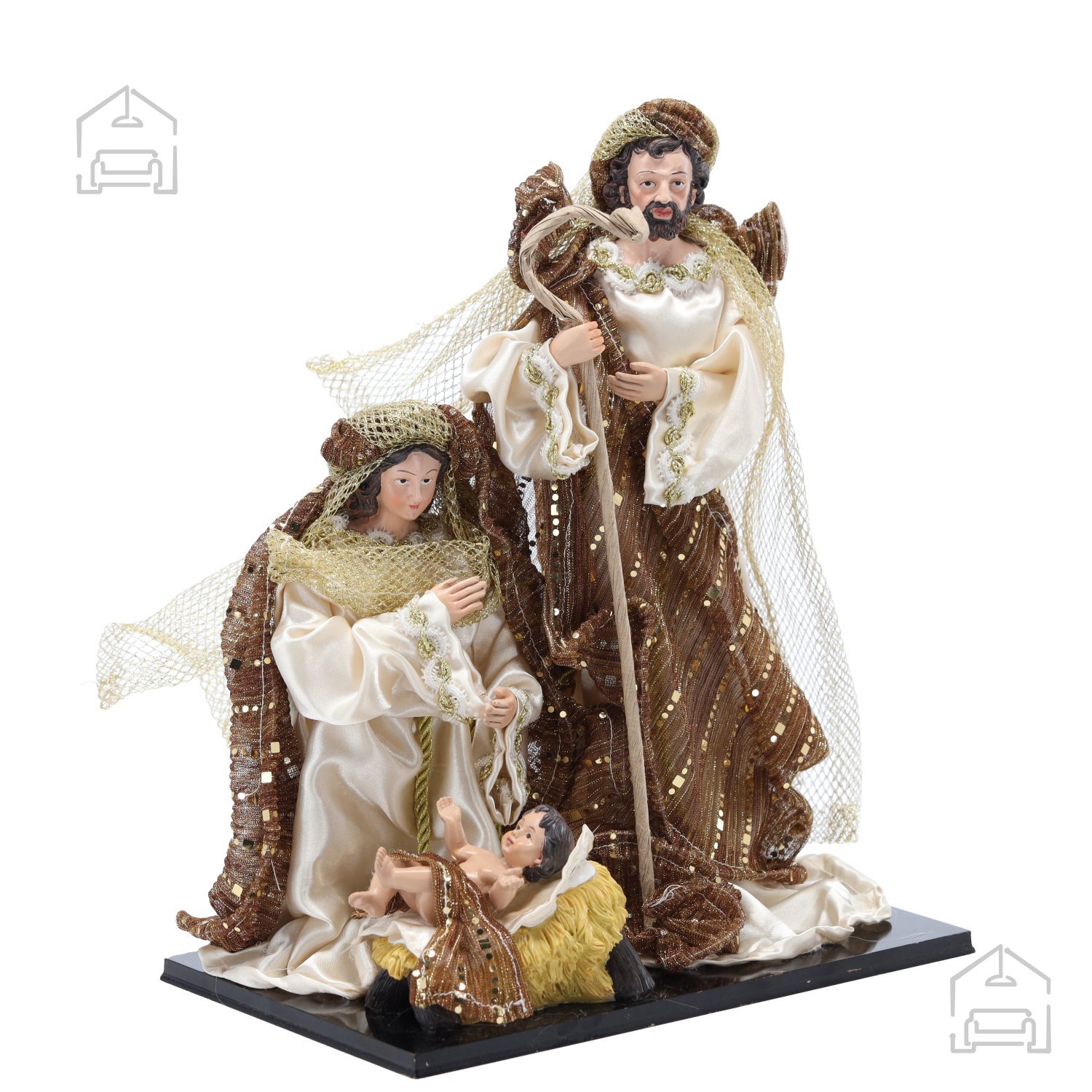 Figura Svete družine ni le dekoracija, temveč tudi izraz spoštovanja do tradicije in pomena družine v božičnem času. Z višino 33 cm je dovolj izrazita, da pritegne pozornost, vendar hkrati dovolj kompaktna, da jo lahko postavite na polico, komodo, kamin ali božično mizo. Material, iz katerega je izdelana, zagotavlja dolgotrajnost, stabilnost in prijeten občutek ročne izdelave. Površina figure je nežno obdelana, kar omogoča, da se svetloba mehko odbija in poudarja toplino svetih motivov.