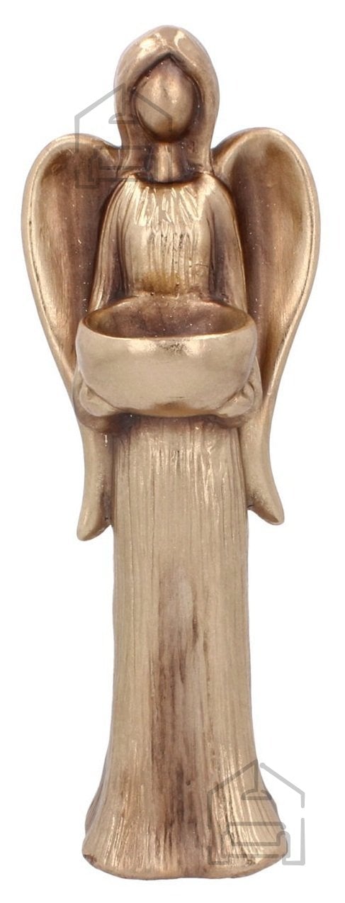 Čeprav proizvajalec ne razkriva natančne sestave materialov, je angel zasnovan tako, da združuje trdnost in eleganco. Njegova površina je obdelana v toplem zlatem tonu, ki se lepo ujame z naravno svetlobo in poudari teksturo detajlov – od kril do nežno oblikovanega obraza. Stoječa konstrukcija mu daje stabilnost, zato ga lahko brez skrbi postavite na ravne površine v notranjosti ali na zaščitenih zunanjih mestih. Zaradi svoje višine 32 cm deluje kot vizualno središče tudi med drugimi okraski, ne da bi bil prevelik ali pretirano dominantnen.