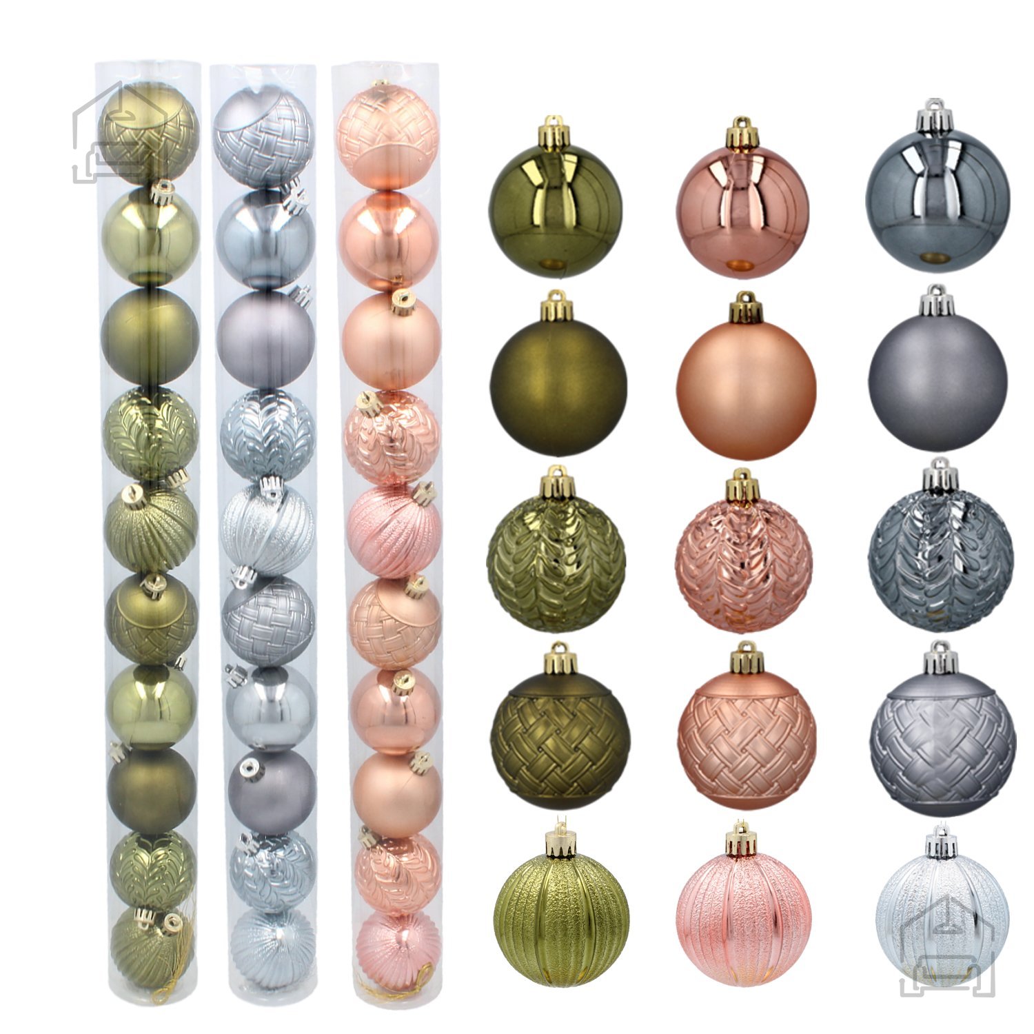 Olivna barva prinaša občutek miru in naravne topline, bakrena dodaja pridih tradicionalnega prazničnega sijaja, medtem ko grafitna barva poskrbi za sodoben kontrast in globino. Skupaj tvorijo komplet, ki omogoča raznolike možnosti aranžiranja – od razkošnih klasičnih postavitev do minimalističnih sodobnih kompozicij. Večbarvnost izdelka omogoča prilagoditev različnim slogom notranje opreme, kar je še posebej priročno za tiste, ki želijo vsako leto osvežiti videz svojega prazničnega drevesa, ne da bi morali kupovati nov komplet okraskov.
