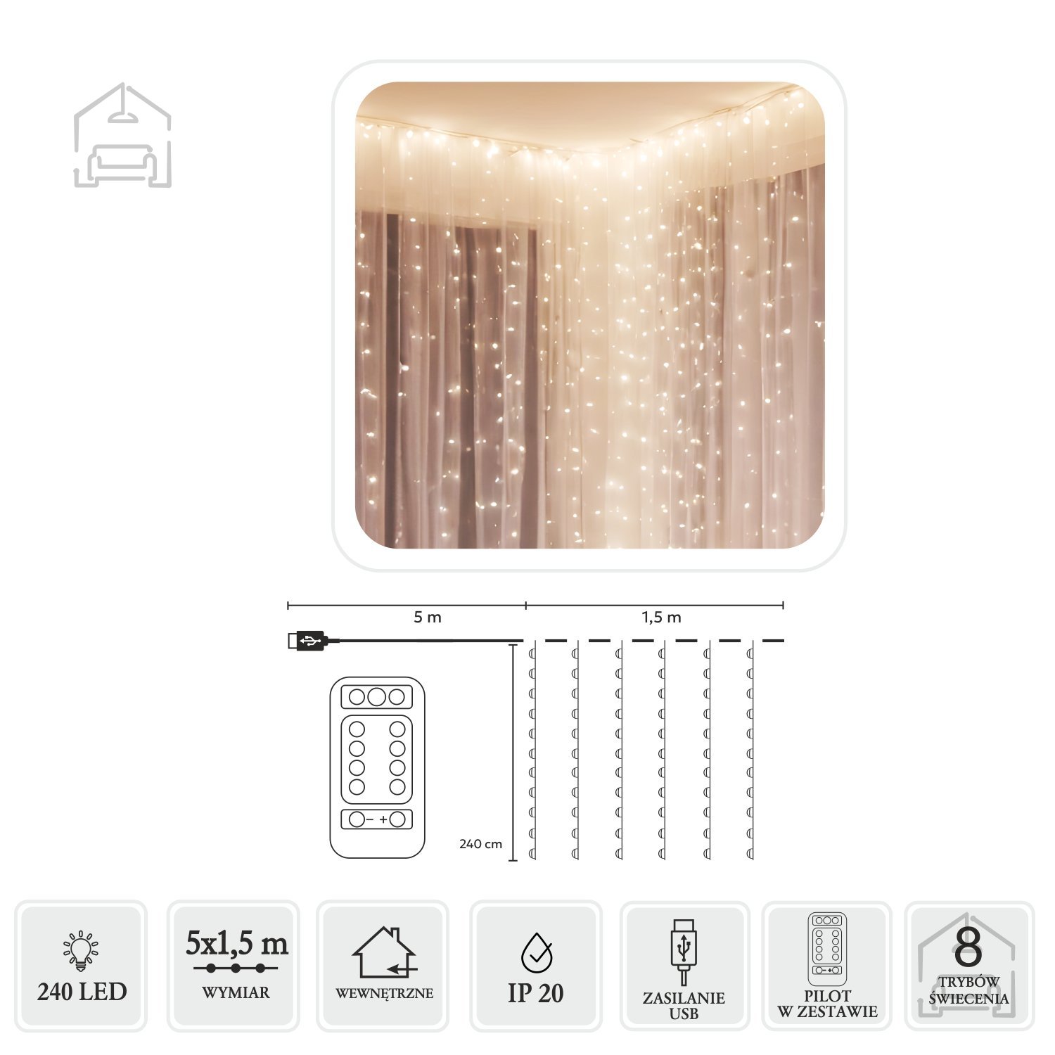 Svetlobna zavesa Žičke 240l toplo bela znamke Chomik ustvarja prijetno, toplo in elegantno svetlobno kuliso, primerno tako za notranjo kot zunanjo uporabo. Njena dolžina svetlobnega dela 5 × 1,5 m omogoča enakomerno porazdelitev svetlobe, medtem ko 240 mikro LED diod oddaja nežno toplo belo svetlobo, ki prostoru doda občutek topline in udobja. Zavesa je zasnovana za enostavno upravljanje – z daljinskim upravljalnikom in 8-funkcijskim programatorjem lahko spreminjate učinke svetljenja ter prilagodite atmosfero trenutku.