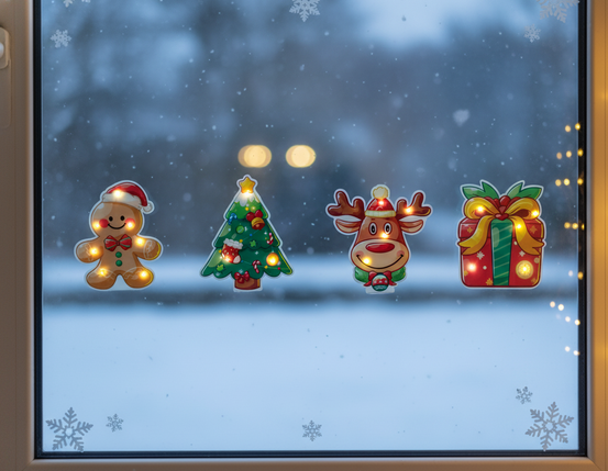 Komplet vključuje različne klasične motive božično-novoletne tematike: jelka simbolizira praznično toplino, darilo veselje ob obdarovanju, severni jelen pa prinaša igrivo noto zimskih pravljic. Piškot kot motiv doda pridih domačnosti in kulinaričnega vzdušja. Kombinacija teh motivov omogoča ustvarjanje lastnih svetlobnih kompozicij na oknih ali drugih površinah.