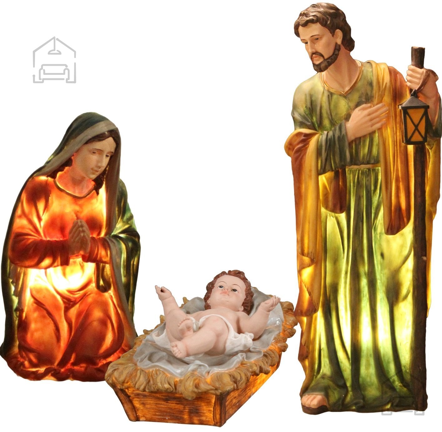 Vsaka figura je izdelana z izjemno pozornostjo do detajlov. Jožef s svojo visoko in mirno držo simbolizira zaščito in moč, Marija s svojimi nežnimi potezami prinaša toplino in milino, Jezušček pa z nežno osvetlitvijo postane središče celotne kompozicije. Skupaj ustvarjajo harmonično celoto, ki izžareva mir in povezanost. Figure se lahko postavijo skupaj kot klasična jaslična postavitev ali pa posamezno, glede na razpoložljiv prostor in dekorativni slog.