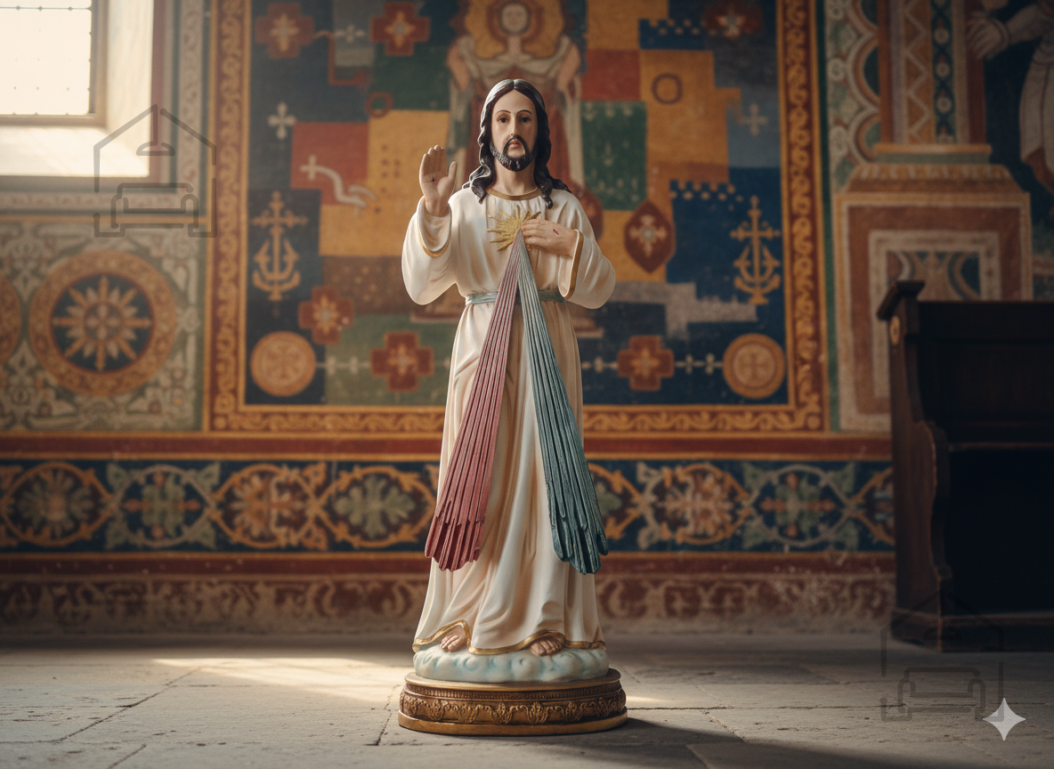 Vsaka figura Jezus Usmiljeni je rezultat natančnega ročnega dela. Proizvajalec Chomik iz Poljske združuje tradicionalne metode kiparstva z modernimi materiali, da doseže izjemno realističen videz. Izrazne poteze obraza, miren pogled in roke v značilni gesti blagoslova ustvarjajo vtis žive prisotnosti. Detajli oblačil, z mehko oblikovanimi gubami in subtilnimi barvnimi prehodi, poudarjajo svetlobne učinke in simbolno moč figure. Steklene oči, ki so skrbno vstavljene v obraz, dajejo kipu globino in občutek resničnosti, kar še povečuje njegov estetski in duhovni pomen.