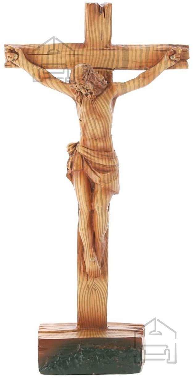 Polirezin, iz katerega je križ izdelan, je znan po svoji trdnosti in gladki površini, ki omogoča fine detajle. Material je odporen na drobne udarce in primeren za dolgotrajno uporabo v notranjih prostorih. Kljub temu je priporočljivo, da se izdelek ne izpostavlja neposredni vlagi ali močnemu soncu, da ohrani barvo in strukturo. Čiščenje je enostavno – zadostuje mehka suha ali rahlo vlažna krpa, brez uporabe agresivnih čistil.