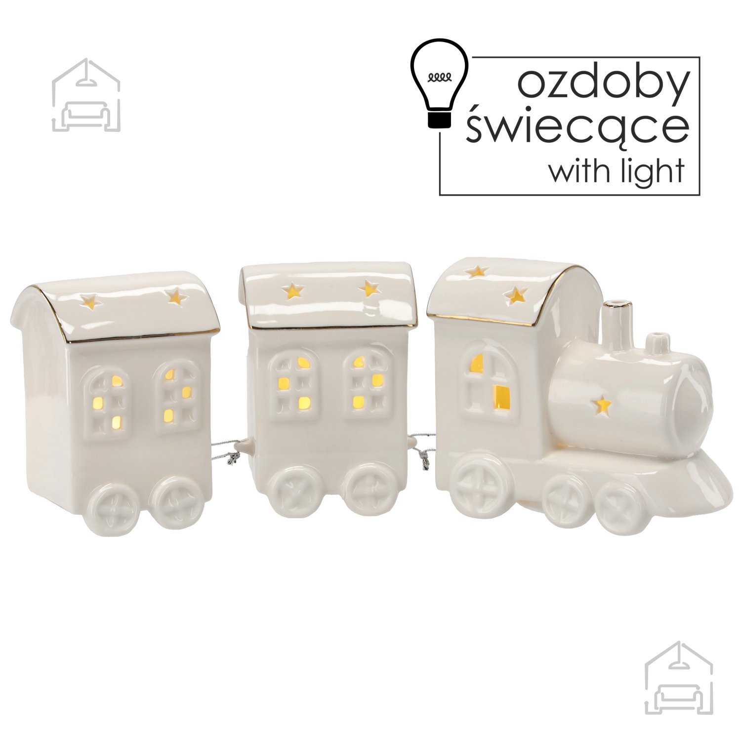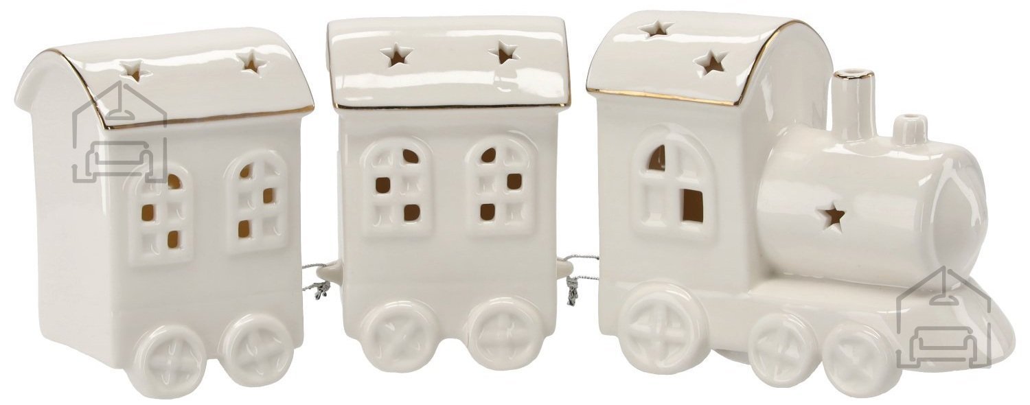 Izdelek je bil izdelan v tovarni Chomik, kjer se prepletata tradicionalna izdelava in sodobna tehnologija LED osvetlitve. Površina figurice je dodelana tako, da ohranja mehko, skoraj porcelanasto teksturo, kar dodatno poudari belino in daje občutek kakovosti. LED lučke so diskretno integrirane, tako da osvetlitev enakomerno poudari vse detajle – od lokomotive do posameznih vagonov. Vsak element je skrbno zložen in trdno pritrjen, kar zagotavlja dolgotrajno uporabo in varno postavitev tudi v bližini drugih dekorativnih elementov.