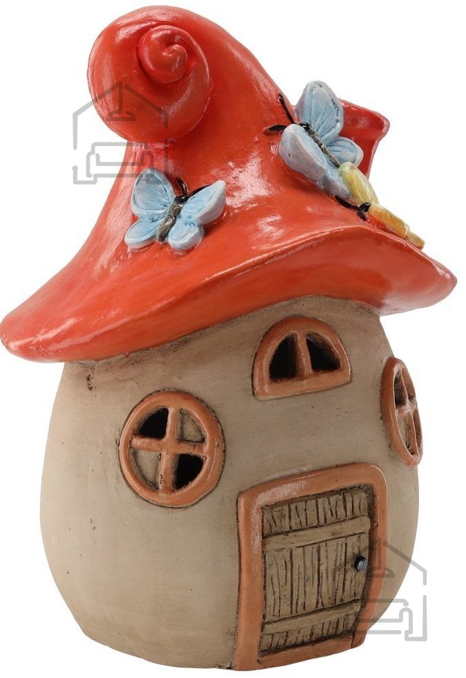 Vgrajena LED osvetlitev se napaja preko sončne plošče, ki čez dan shranjuje energijo in jo ponoči sprošča v obliki nežne svetlobe. Takšen način delovanja omogoča popolno avtonomijo – brez kablov, brez dodatnih stroškov elektrike. Osvetlitev se samodejno vklopi, ko se stemni, in ustvari čudovit svetlobni učinek, ki poudari obliko gobe in drobne detajle hišice.