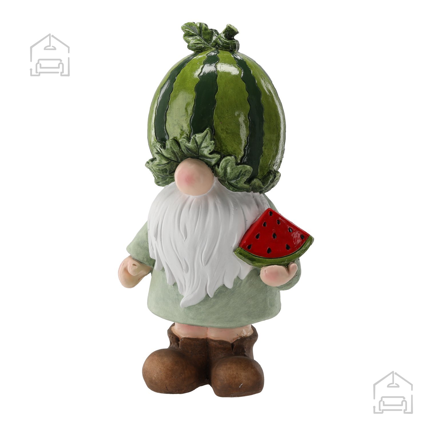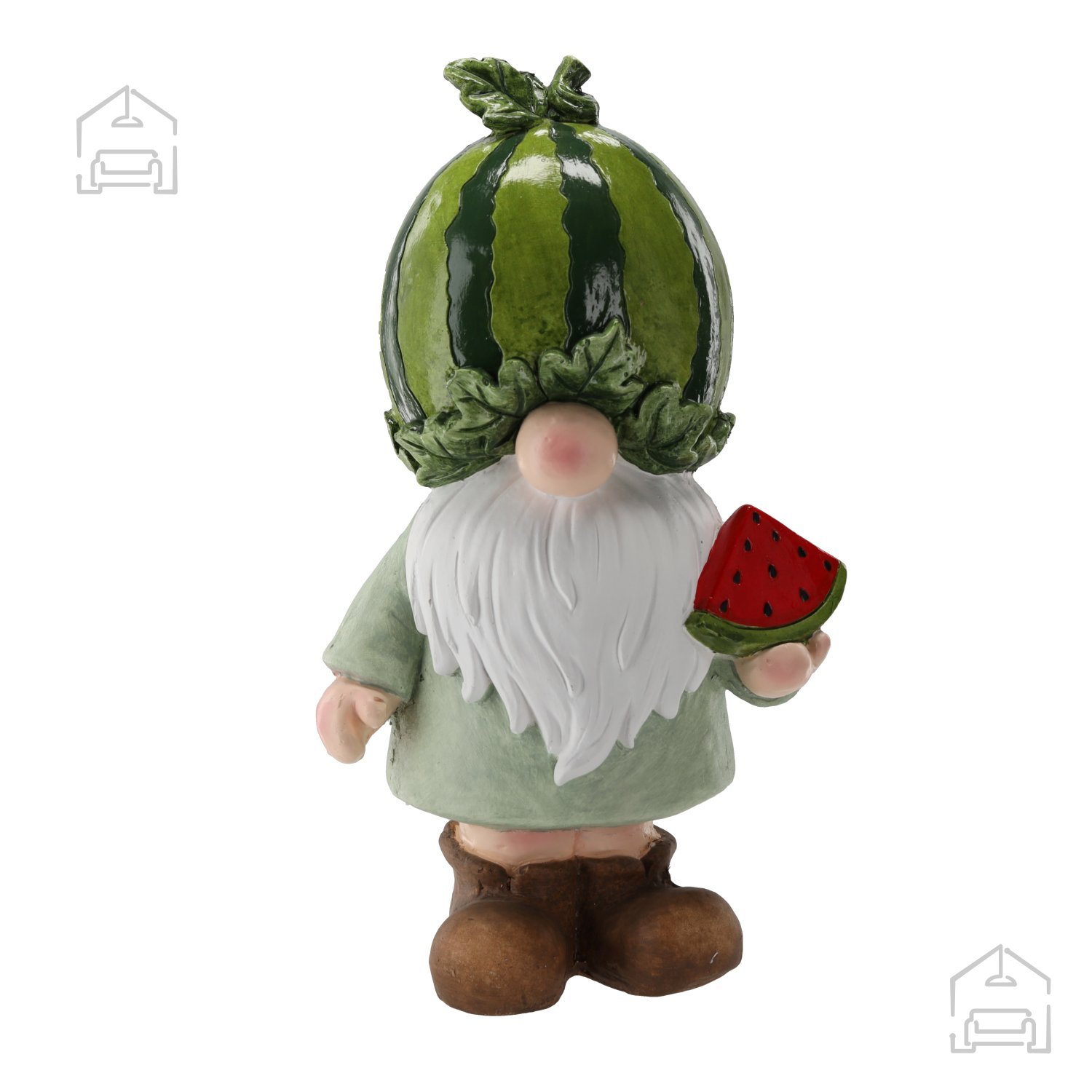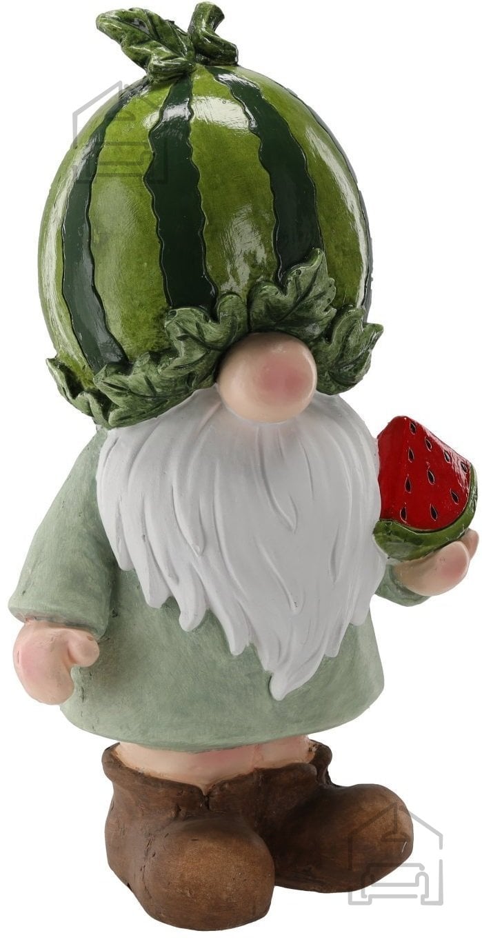 Motiv škrata z lubenico prinaša igrivo poletno energijo. Lubenica, kot simbol osvežitve in brezskrbnosti, se harmonično ujema z zelenimi toni, ki prevladujejo na figurici. Zaradi natančno oblikovanih detajlov – od obraznih potez do teksture lubenice – je vsak kos videti živahno in pristno. Figurica se lepo poda k naravnim materialom, kot so les, kamen ali kovina, zato se zlahka vključi v različne stile vrtne ureditve, od rustikalnega do modernega.