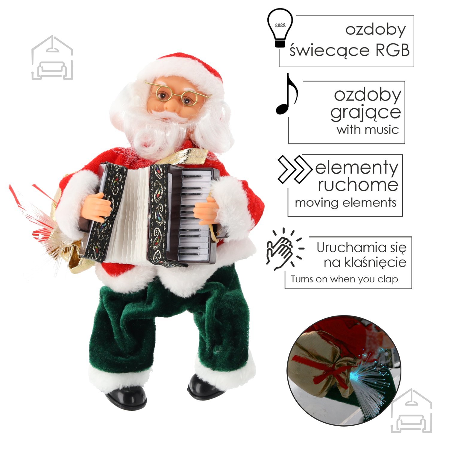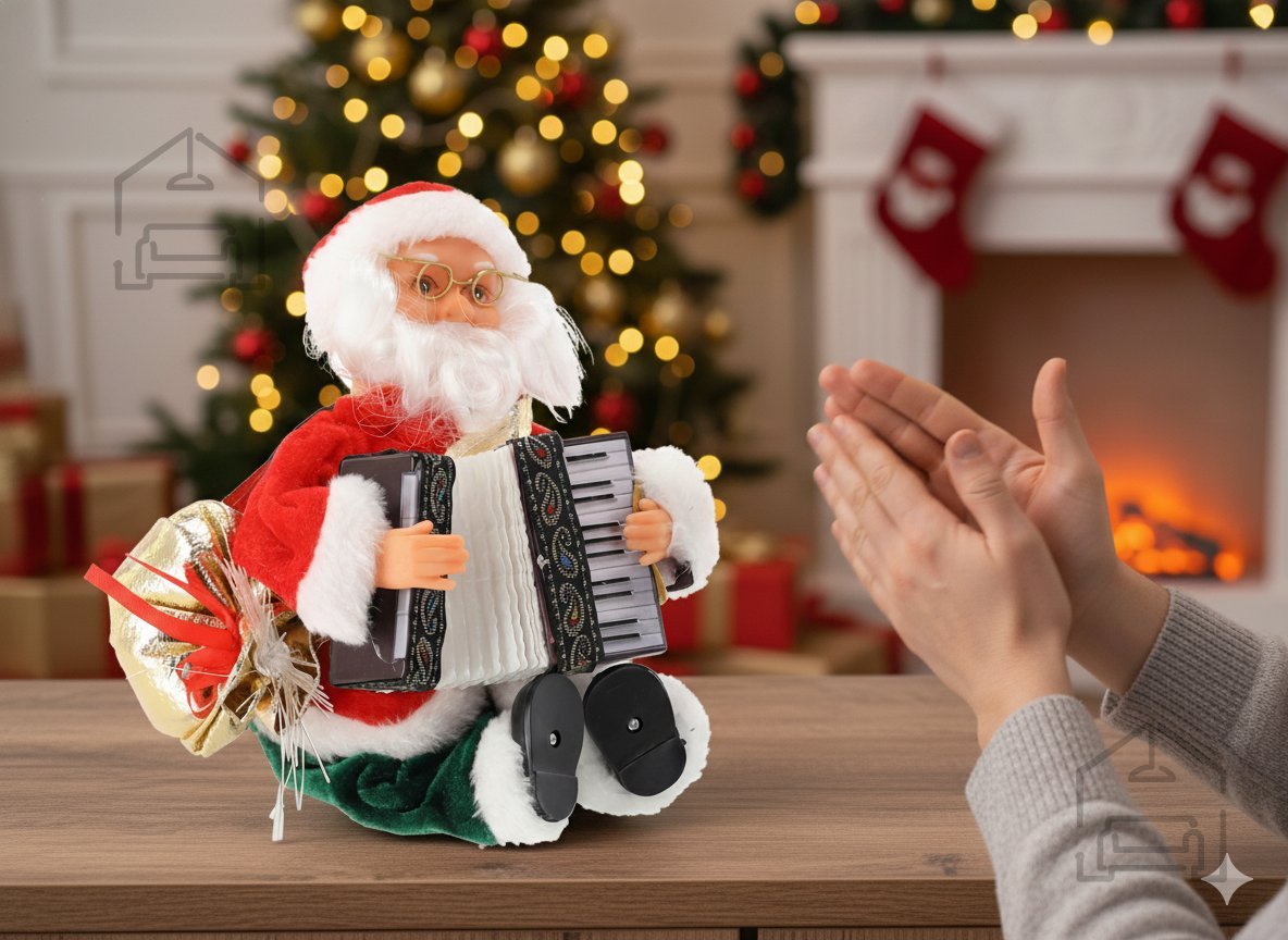 Božiček se ne le sveti, temveč tudi premika roke in akordeon, kar ustvari vtis, da resnično igra. Njegov akordeon se premika v ritmu glasbe, kar daje občutek živosti in dinamike. LED osvetlitev v njegovih dodatkih poskrbi za prijetno toplo svetlobo, ki nežno razsvetli okolico in poudari praznično dekoracijo. Vgrajena funkcija odziva na plosk omogoča, da se Božiček aktivira s preprostim zvokom – en plosk sproži njegovo igranje, gibanje in osvetlitev.
