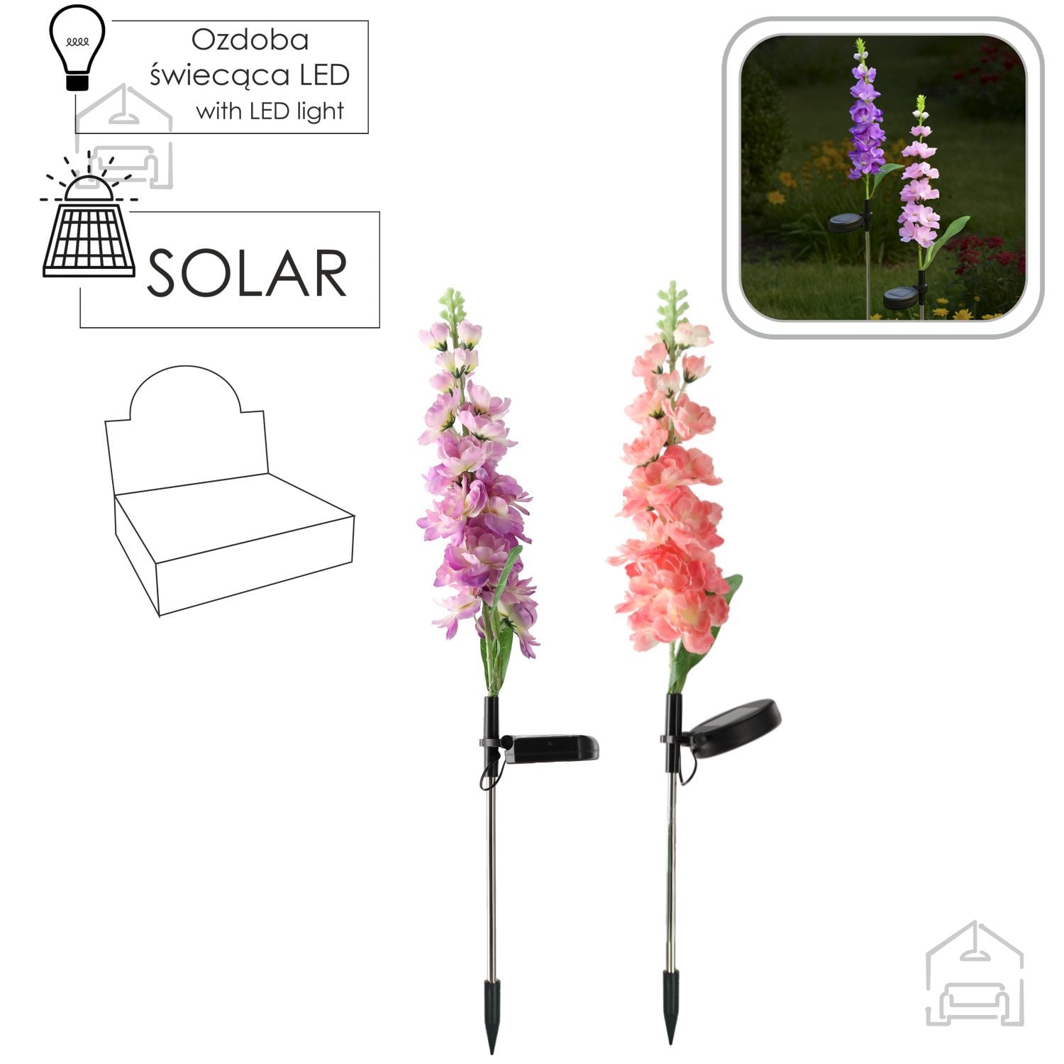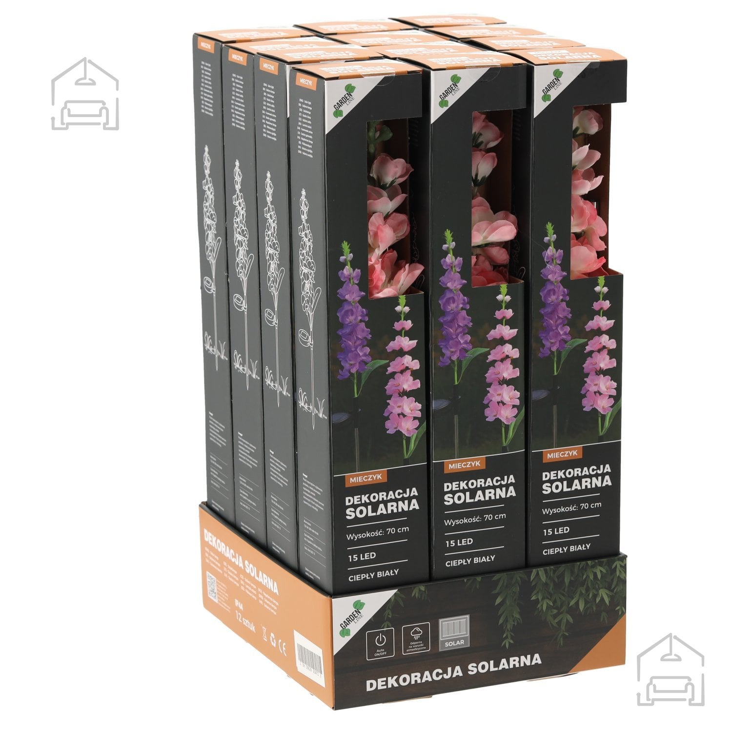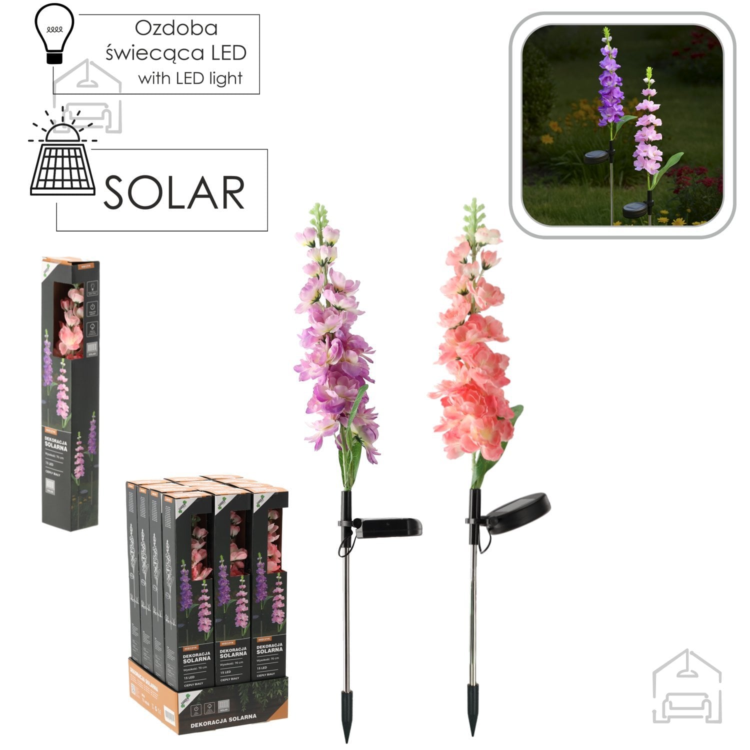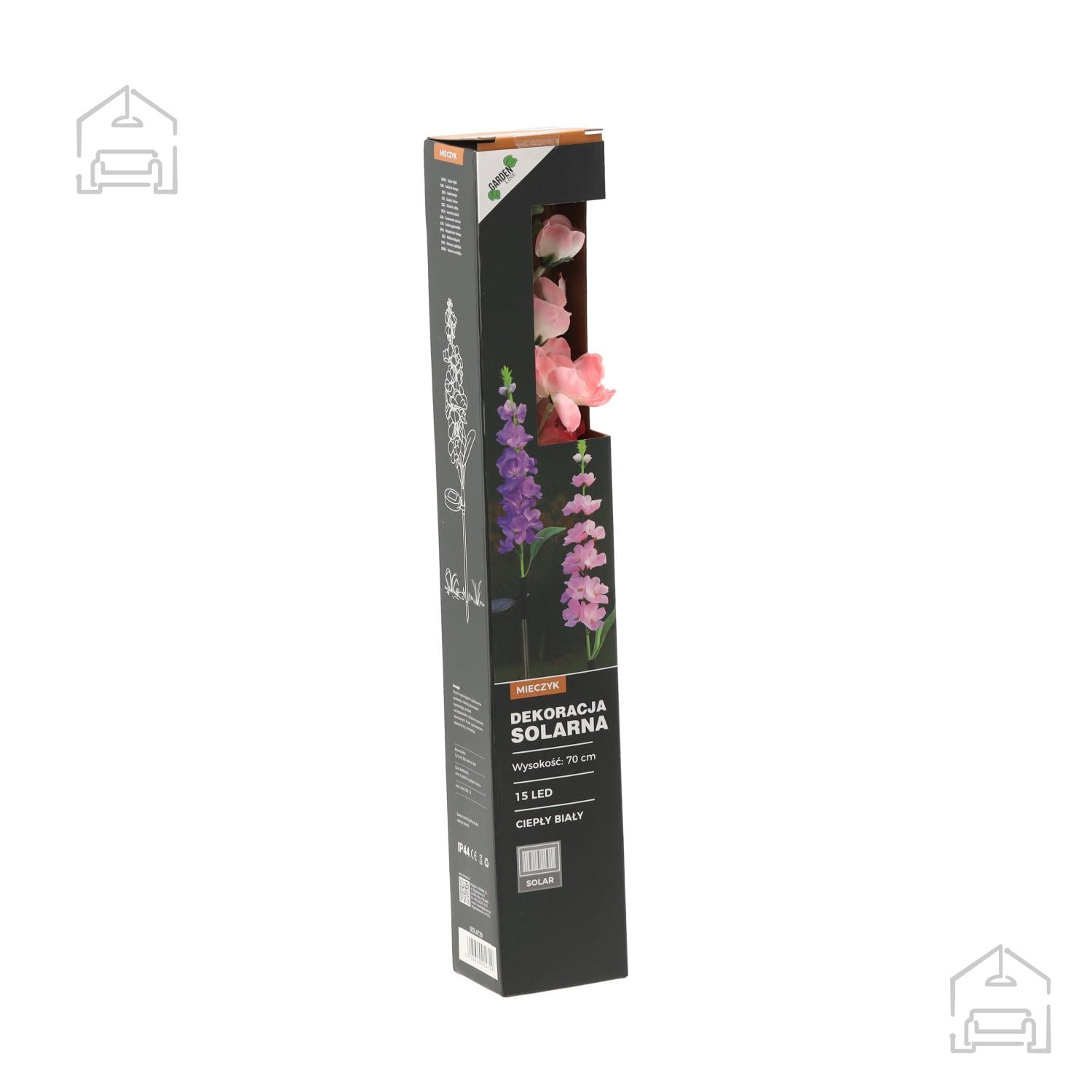 Solarna svetilka Mieczyk je oblikovana v obliki cveta, ki ga dopolnjujejo nežni odtenki rožnate ali vijolične barve. Ti barvni toni se lepo ujemajo z naravnimi motivi na vrtu in ustvarjajo občutek živosti tudi po sončnem zahodu. Zaradi toplo bele svetlobe LED diod svetilka ne deluje vsiljivo, temveč poudari strukturo rastlin in zunanjega prostora. Uporabniki lahko izberejo barvo cvetov glede na slog vrta ali osebne preference, kar omogoča dodatno prilagoditev ambienta.