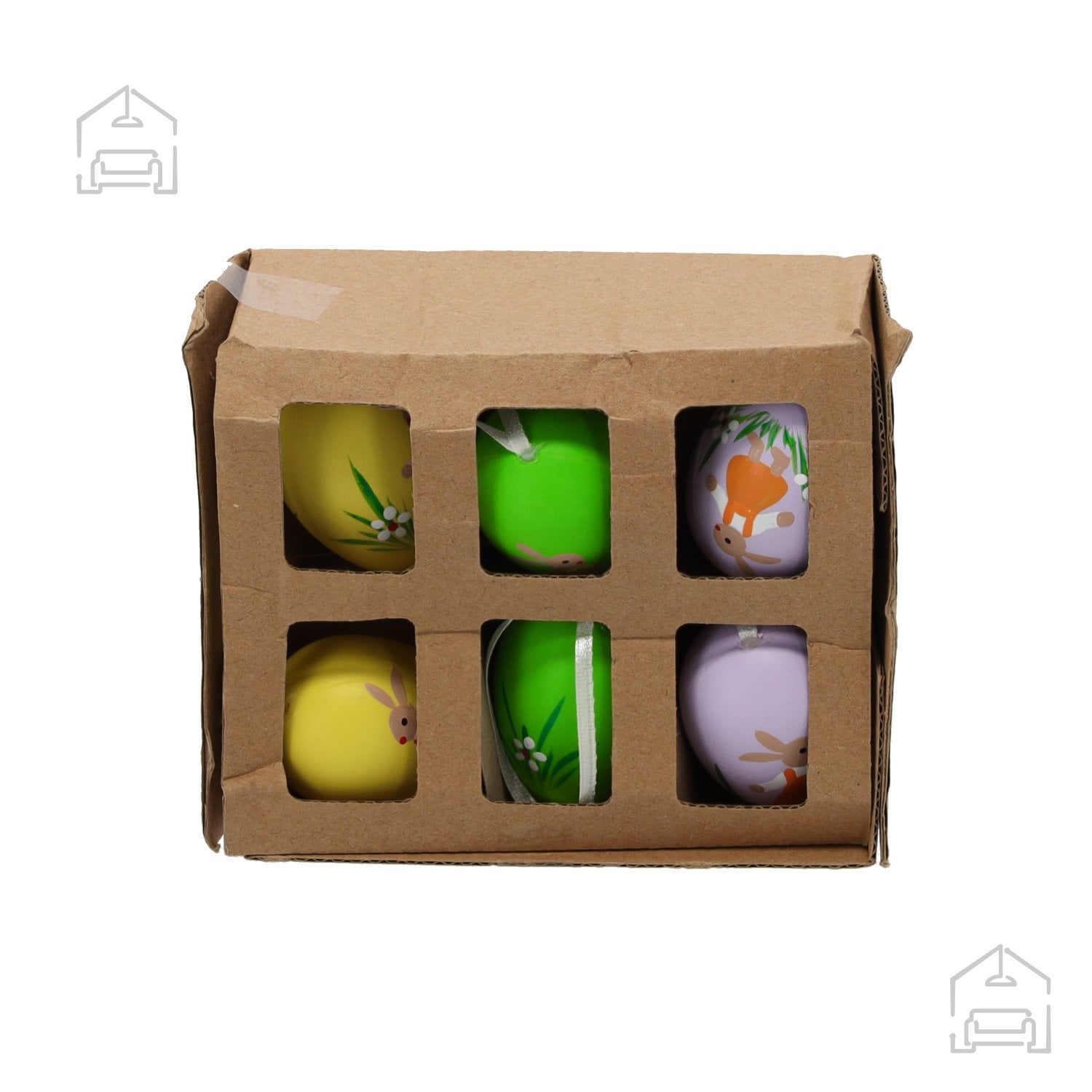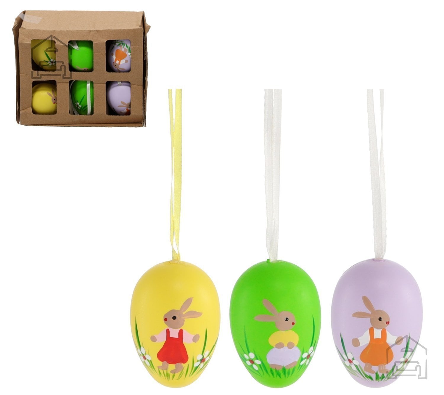 Komplet sestavlja šest velikonočnih jajc z dodanimi figuricami zajčkov, ki skupaj tvorijo harmonično in razgibano praznično postavitev. Dimenzije celotnega kompleta znašajo 14,5×3×13 cm, zato ga je enostavno umestiti na manjše površine, police ali okenske police. Elementi so oblikovani v različnih barvnih odtenkih, kar daje dekoraciji živahen in vesel videz. Zaradi večbarvne izvedbe se komplet lepo ujema z drugimi velikonočnimi dodatki, kot so venci, košarice ali svečniki.