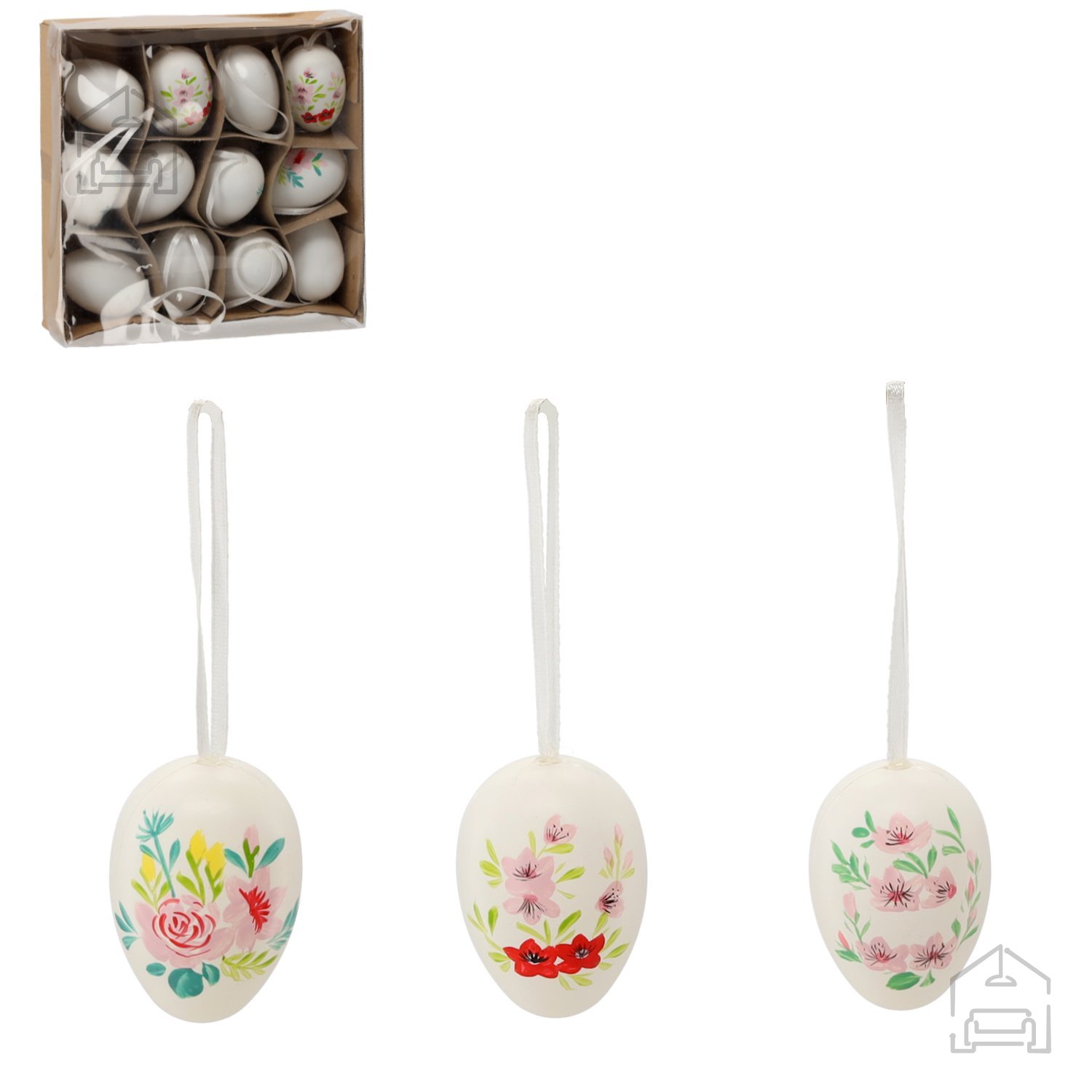 Komplet vsebuje 12 kosov v skupni embalaži velikosti 19x19x5 cm. Takšna zasnova omogoča enostavno shranjevanje in transport, hkrati pa ščiti posamezna jajca pred poškodbami. Bela barva omogoča, da jih po želji dodatno okrasite – z barvami, bleščicami, trakovi ali nalepkami. Izdelek je primeren tako za osebno ustvarjanje kot tudi za profesionalne dekoraterje, ki želijo svojim aranžmajem dodati praznično noto.