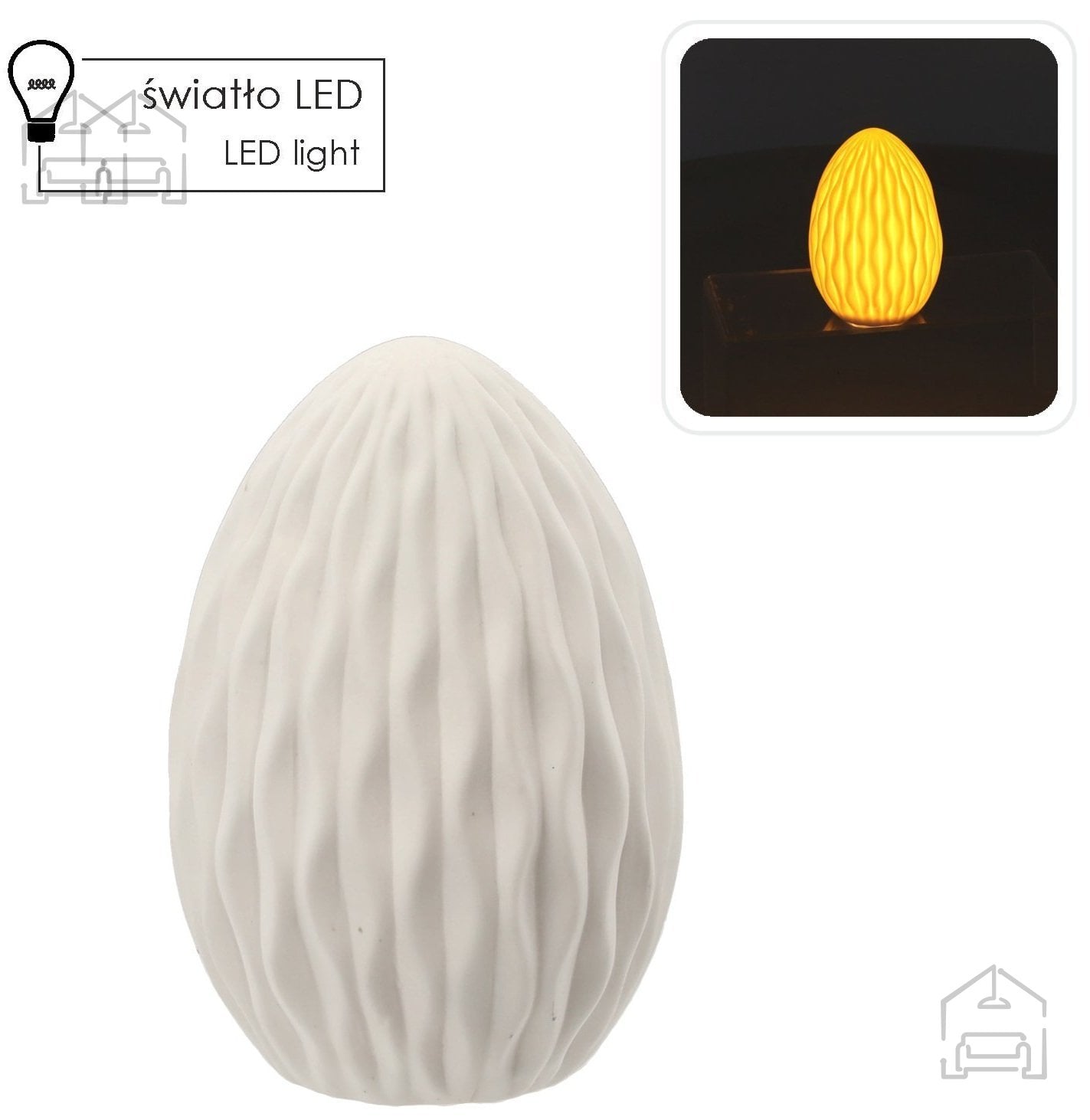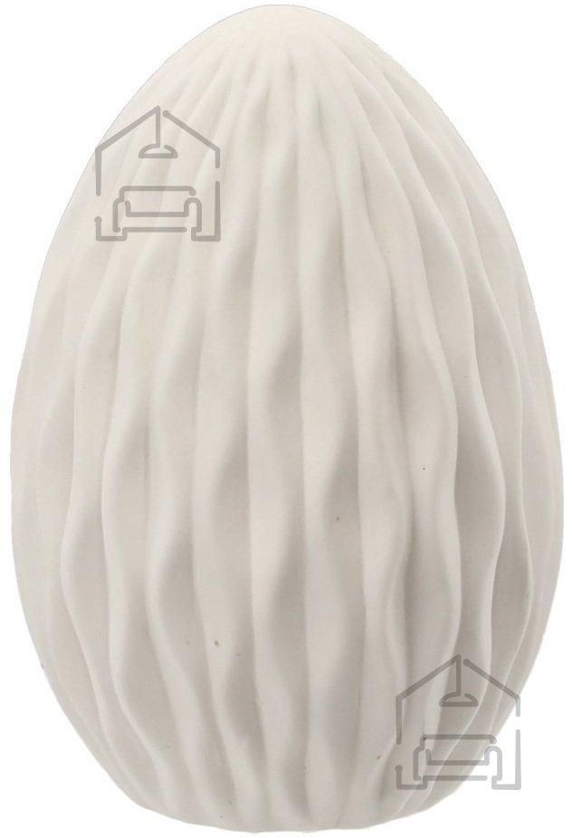 Ta nežno oblikovana velikonočna figurica v obliki jajca združuje tradicionalni simbol praznika z modernim svetlobnim učinkom. Izdelana je iz kakovostne keramike in dopolnjena z LED osvetlitvijo, ki v prostoru ustvari prijetno, toplo svetlobo. Z dimenzijami 9,5x9,5x14 cm se lepo prilega tako na mizo, polico ali okensko polico, kjer lahko postane osrednji dekorativni poudarek. Izdelek prihaja iz tovarne Chomik na Poljskem, ki je znana po izdelavi kakovostnih sezonskih dekoracij.