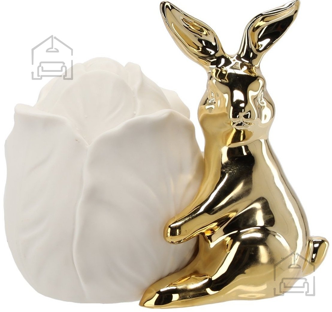 Ta ljubka velikonočna figurica v obliki zajčka združuje tradicionalen simbol pomladi z modernim pridihom sijaja. Izdelana je iz kakovostne keramike v beli barvi in okrašena z zlatimi poudarki, ki ji dajejo prestižen videz. Zajček drži cvet z vgrajeno LED osvetlitvijo, ki v prostoru ustvari prijetno, mehko svetlobo in poskrbi za toplo vzdušje ob prazničnih večerih.