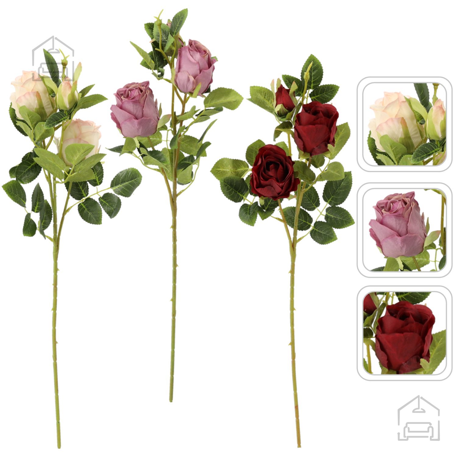Vsaka veja vsebuje tri skrbno oblikovane cvetove vrtnic, ki posnemajo naravno obliko in teksturo pravega cveta. Barvne različice omogočajo enostavno prilagoditev različnim slogom notranje opreme – od klasičnih do sodobnih ambientov. Večbarvni toni ustvarjajo bogat vizualni učinek in omogočajo, da umetna veja postane osrednji poudarek v vazi ali šopku.