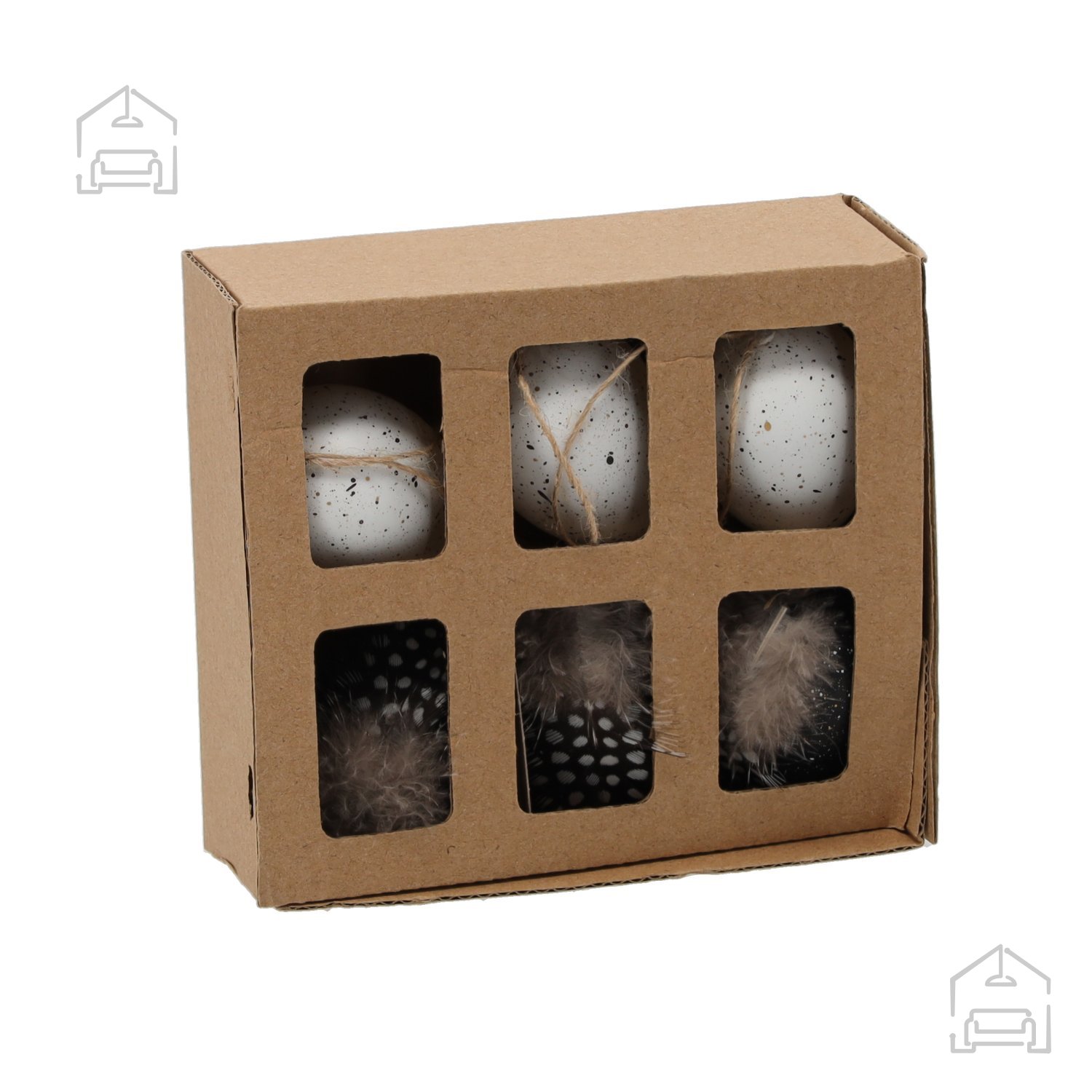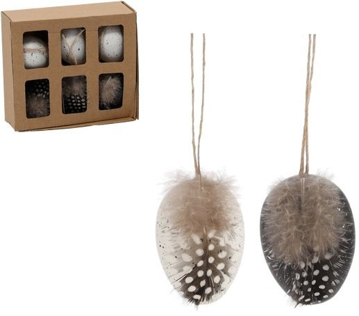 Celoten komplet meri približno 14,5 × 13 × 3 cm, kar omogoča preprosto shranjevanje in uporabo. Posamezna jajca so zasnovana tako, da so lahka in primerna za obešanje. Komplet je v beli in črni barvi – barvni kombinaciji, ki se lepo poda tako k tradicionalnim kot sodobnim velikonočnim dekoracijam. Nevtralni toni omogočajo, da jih zlahka kombinirate z drugimi barvnimi dodatki ali naravnimi materiali, kot so les, perje ali suho cvetje.