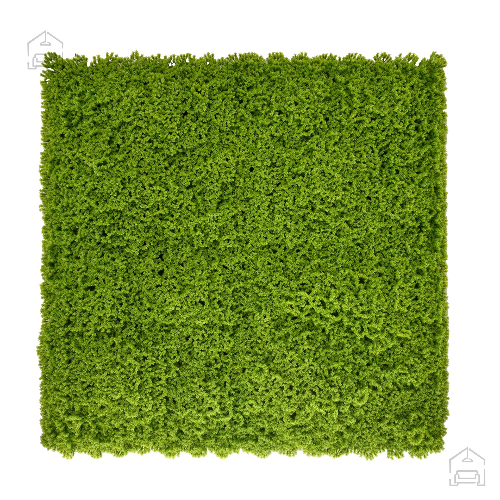 Osnova plošče je izdelana iz prožnega, a trpežnega PE materiala. Ta plastika je znana po svoji odpornosti na vlago, UV-sevanje in temperaturne spremembe. Zahvaljujoč vgrajenemu UV filtru plošča ne bledi in ohranja svojo globoko zeleno barvo tudi ob daljši izpostavljenosti soncu. Certificirana zaščita potrjuje, da material ne vsebuje škodljivih snovi in je varen za zdravje, zato je uporaba v notranjih prostorih popolnoma varna. Površina je brez vonja, kar pomeni, da ne sprošča nobenih kemičnih ali organskih vonjav, kot jih lahko oddajajo naravne rastline ali nekatere umetne mase slabše kakovosti.