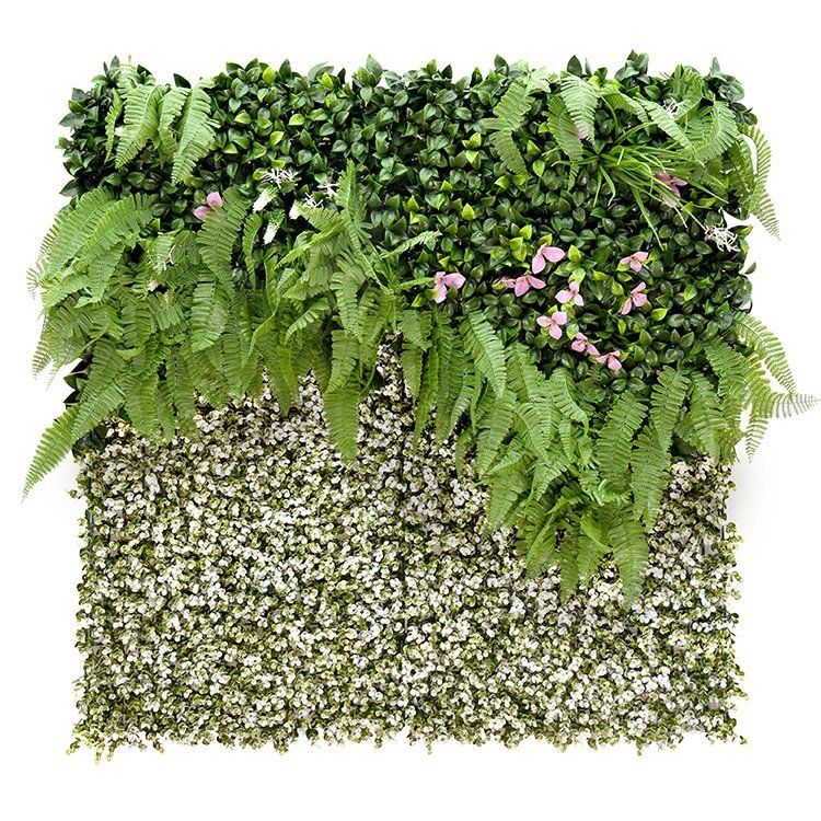 Umetno rastlinje na panelu je gosto razporejeno in natančno oblikovano, da ustvarja naraven tridimenzionalni učinek. Barvni odtenki so skrbno izbrani, da posnemajo videz pravega cvetočega rastlinja, kar omogoča elegantno in živo popestritev sten, ograj ali pregrad. Panel se lahko uporablja kot samostojen dekorativni element ali kot del večjih zelenih sten, ki učinkovito zakrijejo manj privlačne površine.