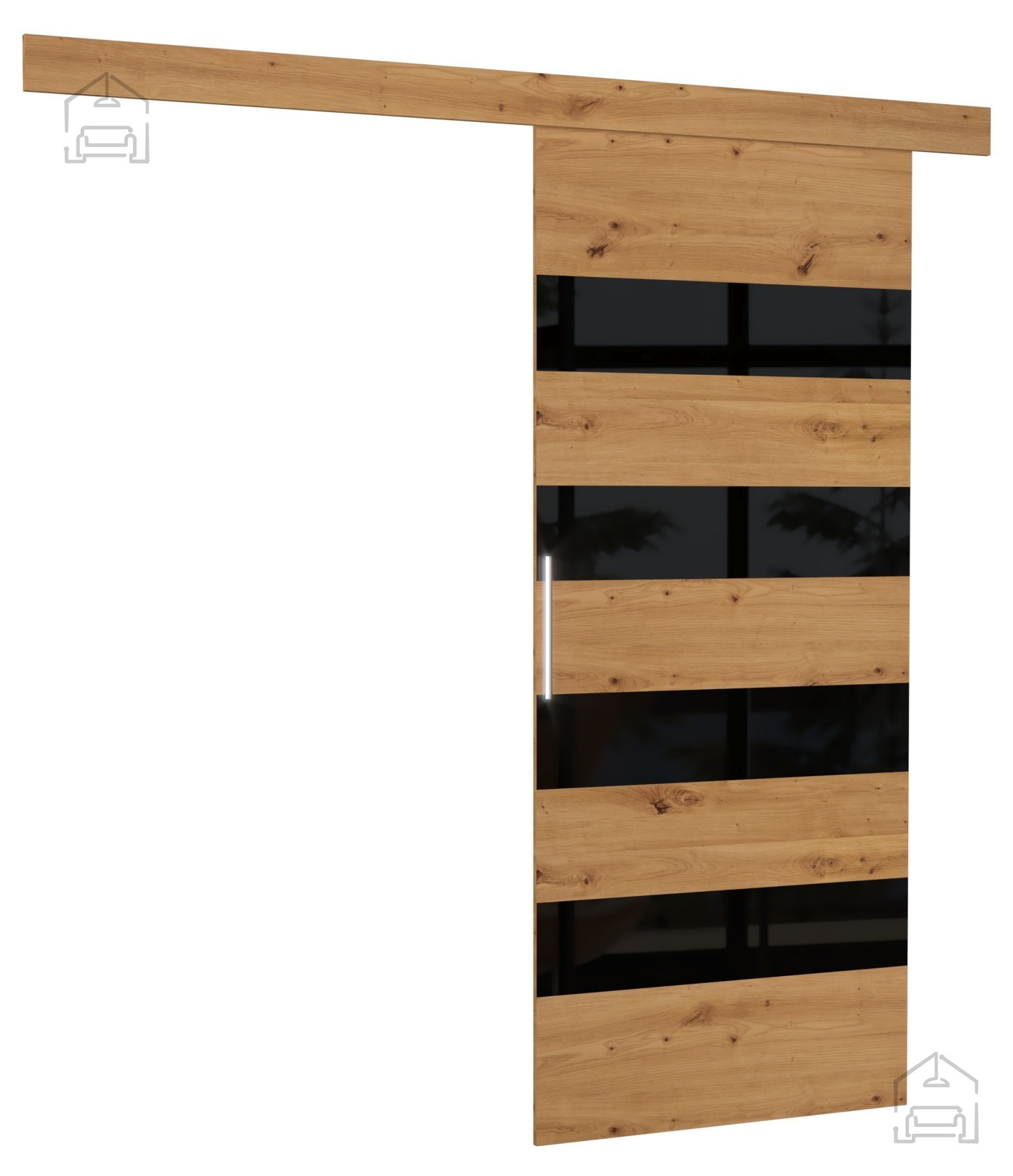 Kombinacija artisan hrasta in črne barve ustvarja harmoničen, a hkrati izrazit kontrast, ki poudari sodoben značaj notranjosti. Vrata lahko postavite kot subtilen dodatek k minimalističnemu dekorju ali kot izrazit poudarek v industrijskem, skandinavskem ali rustikalnem prostoru. Trden aluminijast ročaj širine 28 mm dodaja pridih elegance in hkrati omogoča udoben oprijem.