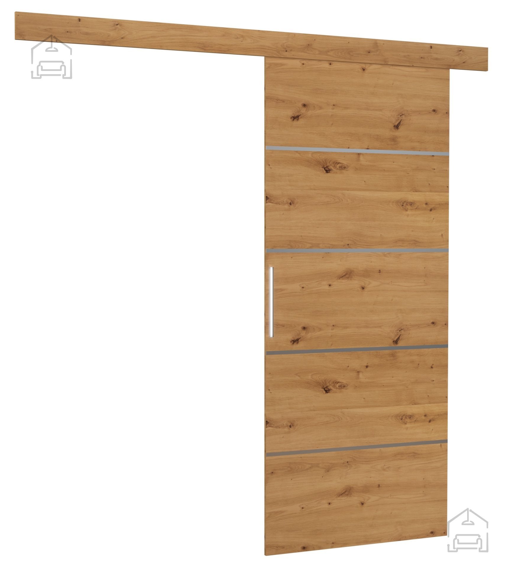 Vrata so izdelana iz kakovostne iverne plošče debeline 16 mm, ki se ponaša z uravnoteženim razmerjem med trpežnostjo, težo in enostavnim vzdrževanjem. Površina je obdelana v odtenku artisan hrasta, kar daje vratom naraven videz in otip, hkrati pa jih ščiti pred vsakodnevnimi obremenitvami. Aluminijast ročaj s premerom Ø28 mm je ergonomsko oblikovan in odporen proti obrabi, zato ostane privlačen tudi po daljši uporabi.
