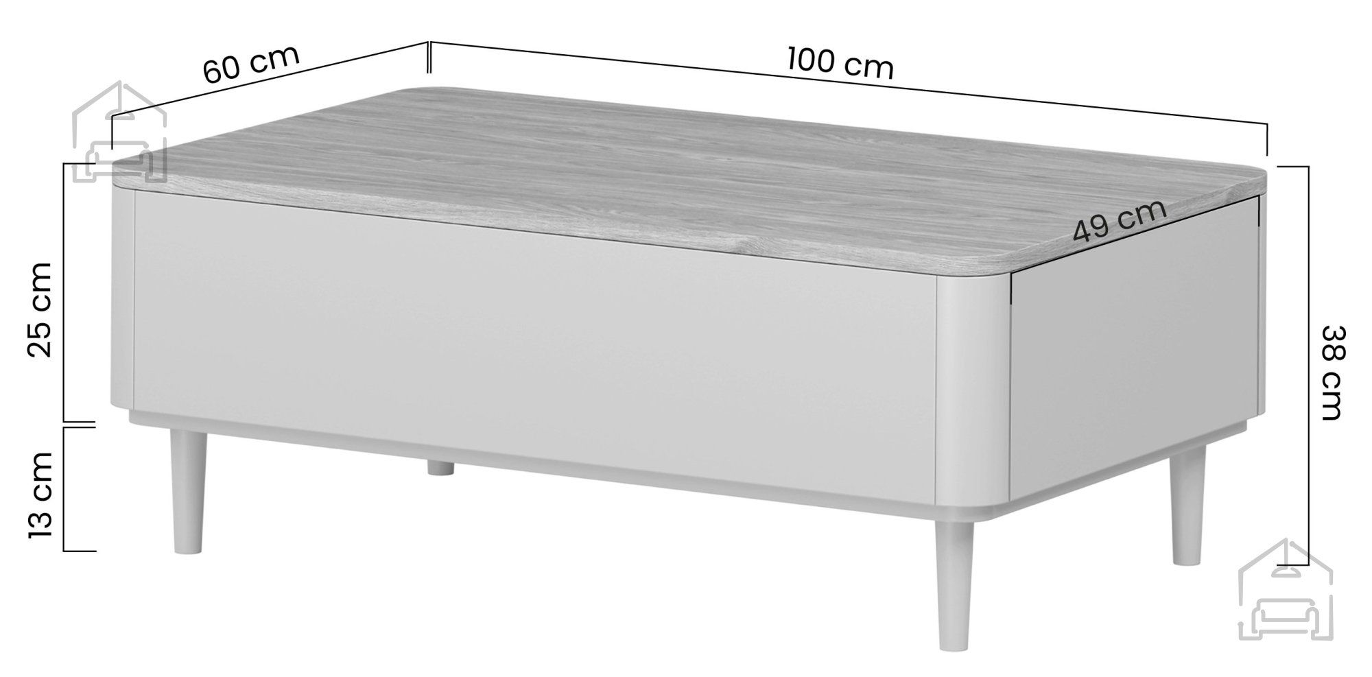Mizica stoji na štirih bukovih nogicah višine 13 cm, ki ji dajejo stabilnost in vizualno lahkotnost. Višina nogic omogoča enostavno čiščenje pod pohištvom, kar je še posebej priročno v vsakodnevnem življenju. Zaradi dvignjene konstrukcije je mizica videti elegantna in prostorna, obenem pa prispeva k občutku zračnosti v prostoru.