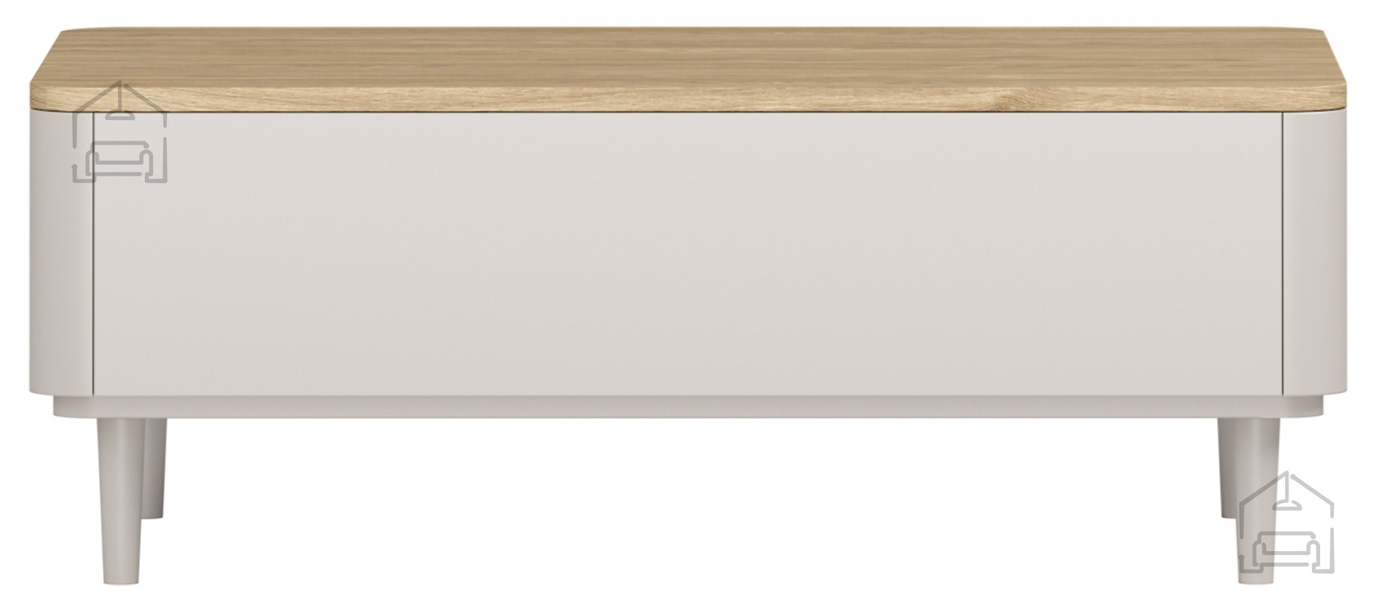 Glavna značilnost modela Elivo 100 2SZ je skrbno izbrana kombinacija materialov. Telo in fronte so izdelane iz melaminskih plošč, znanih po svoji odpornosti na praske in enostavnem čiščenju, medtem ko nogice iz masivnega bukovega lesa zagotavljajo stabilnost in toplino naravnega materiala. Površina v odtenku kašmirja se harmonično dopolnjuje z dekorjem oljenega hrasta, kar daje pohištvu pridih naravne elegance. Zaobljeni robovi skrbijo za varnost in mehkejši vizualni vtis, kar je posebej pomembno v družinskih prostorih.