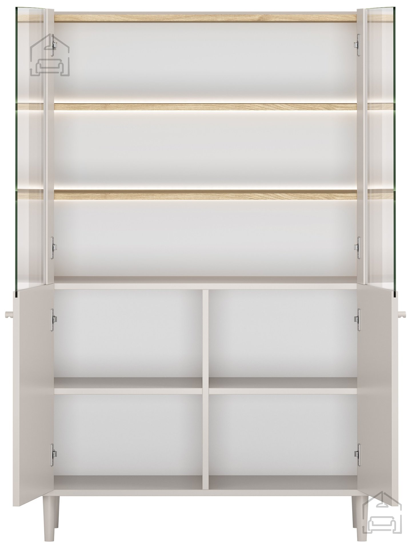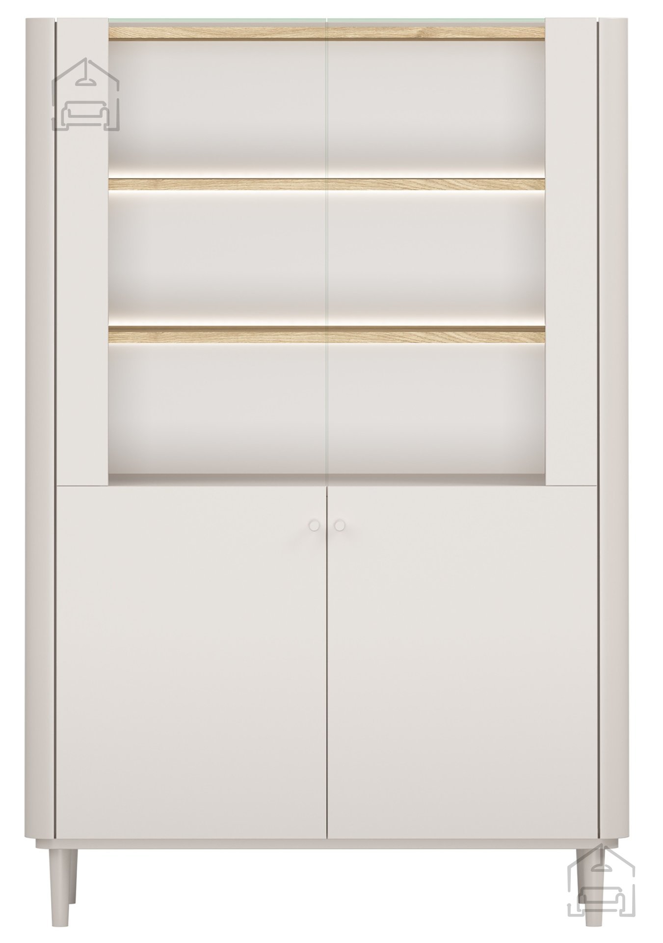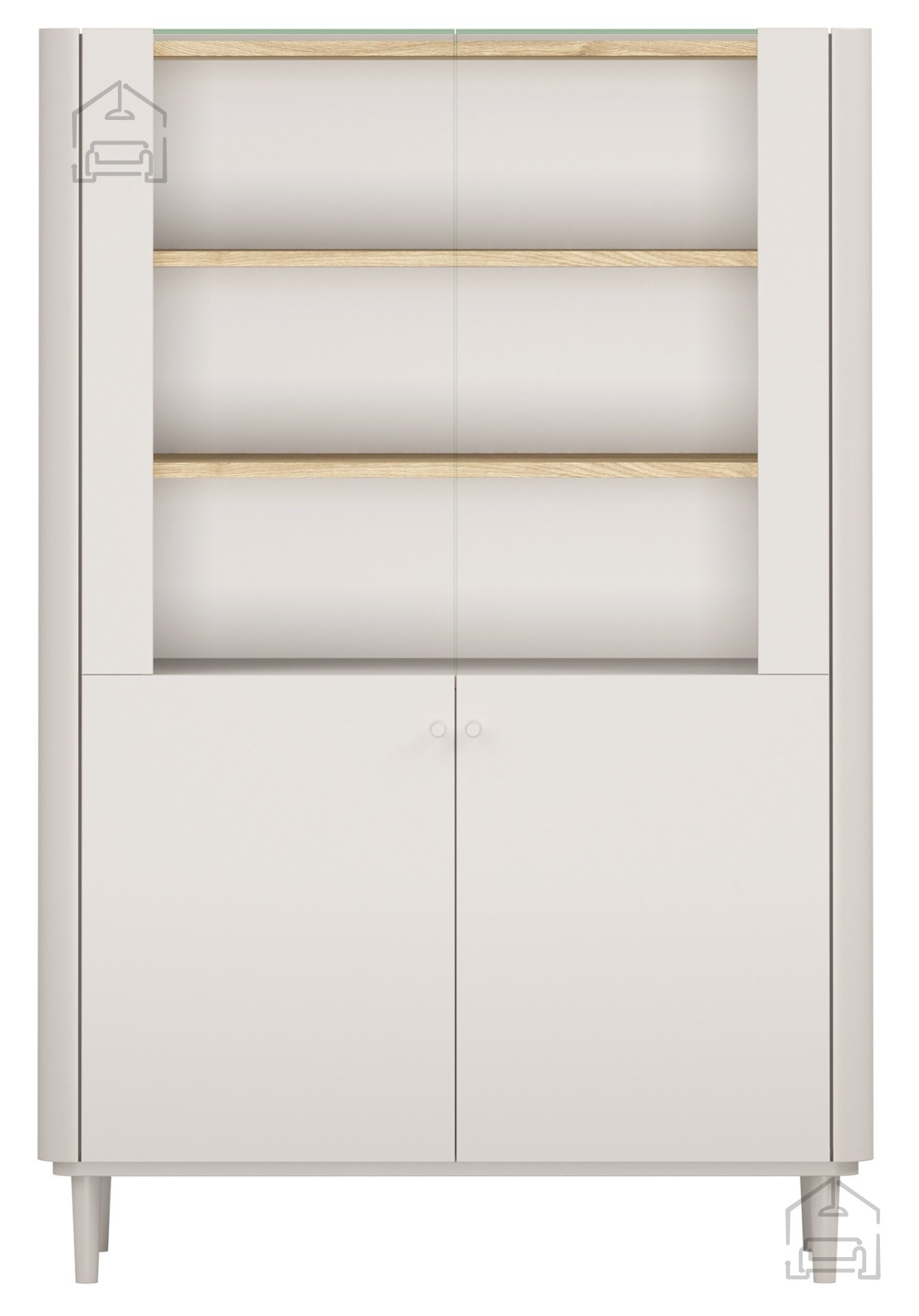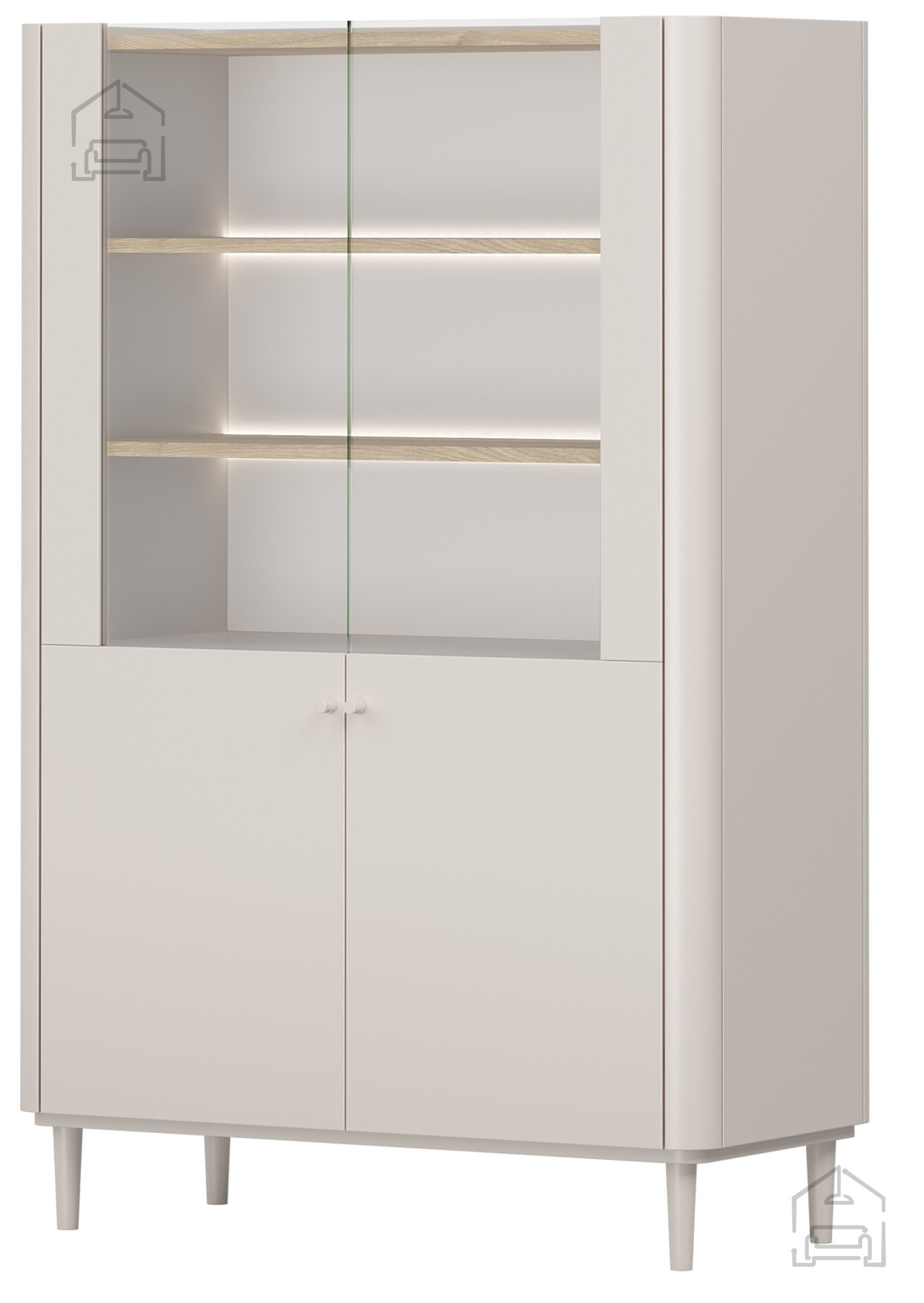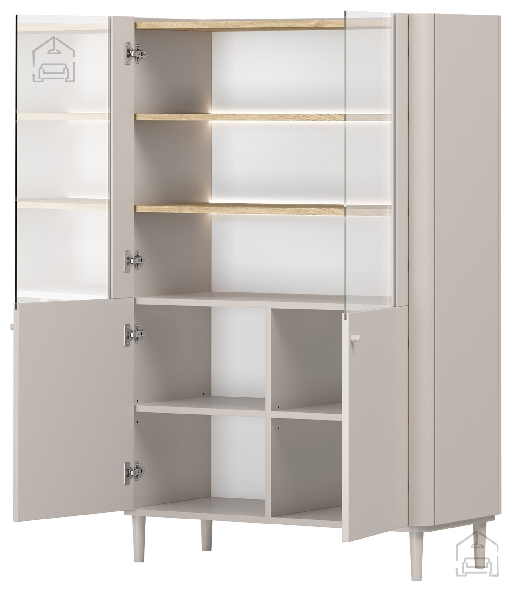Vitrina Elivo 100 2D z nogicami – kašmir / naoljen hrast je sodoben kos pohištva, ki združuje estetski videz, funkcionalno zasnovo in kakovostno izdelavo. S svojimi dimenzijami 100x48x150 cm se odlično prilega različnim prostorom – od dnevne sobe do jedilnice ali celo predsobe. Kombinacija nežne barve kašmir z naravno toplino oljenega hrasta ustvarja prijetno, uravnoteženo barvno harmonijo, ki dopolnjuje sodobne notranje trende in poudarja eleganco prostora.
