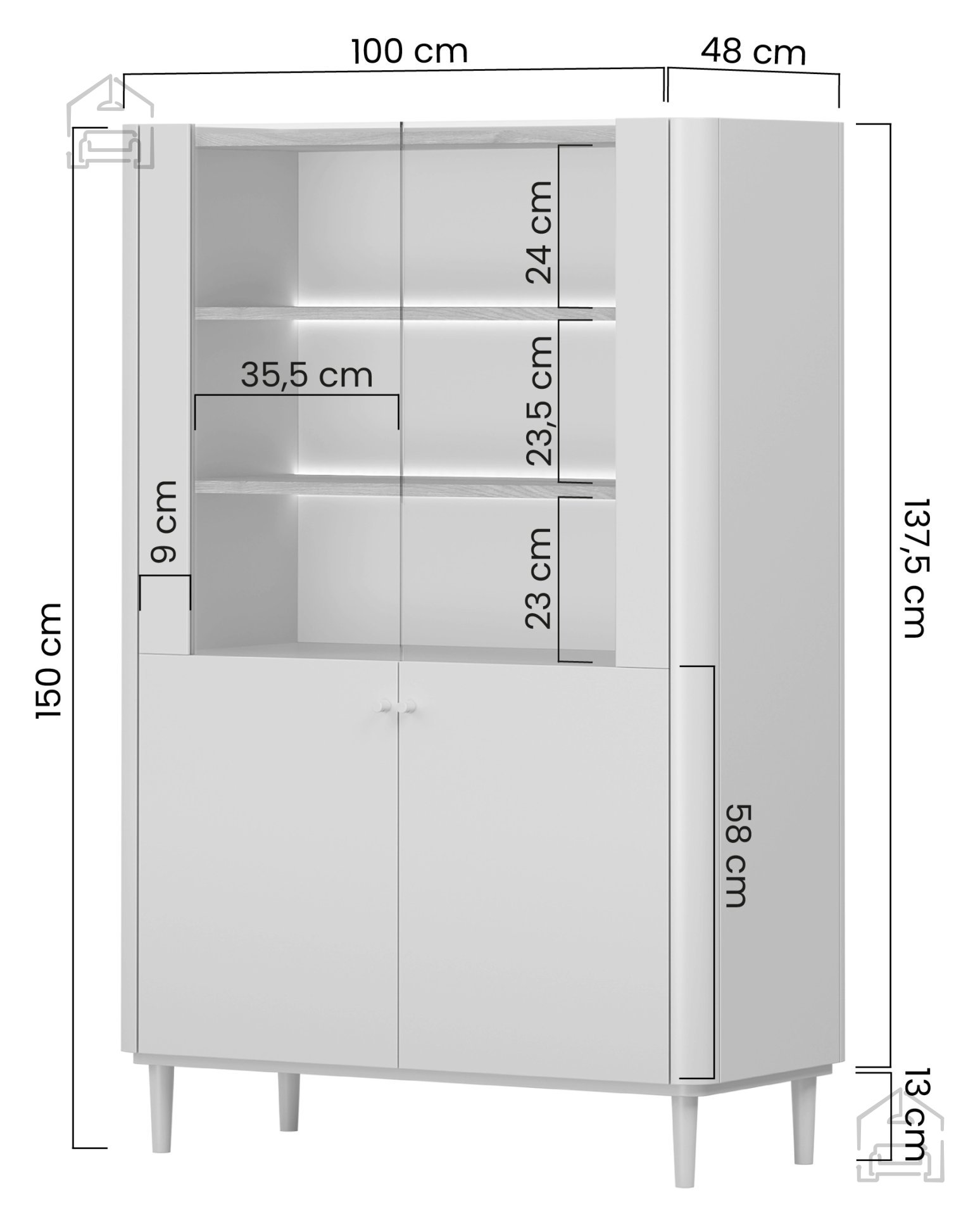 Vitrina je izdelana iz trpežnih materialov – melaminske plošče in MDF plošč debeline 18 mm, kar zagotavlja stabilnost in dolgo življenjsko dobo. Površine so odporne na vsakodnevno uporabo, enostavne za čiščenje in ohranjajo svoj videz tudi po več letih. Zaobljeni robovi prispevajo k varnosti in elegantnemu videzu, medtem ko minimalističen slog poudarja sodobno estetiko. S steklenimi frontami vitrina omogoča razstavitev najlepših kosov porcelana, dekoracij ali knjig, LED osvetlitev pa diskretno poudari njihovo lepoto in ustvari prijetno vzdušje.