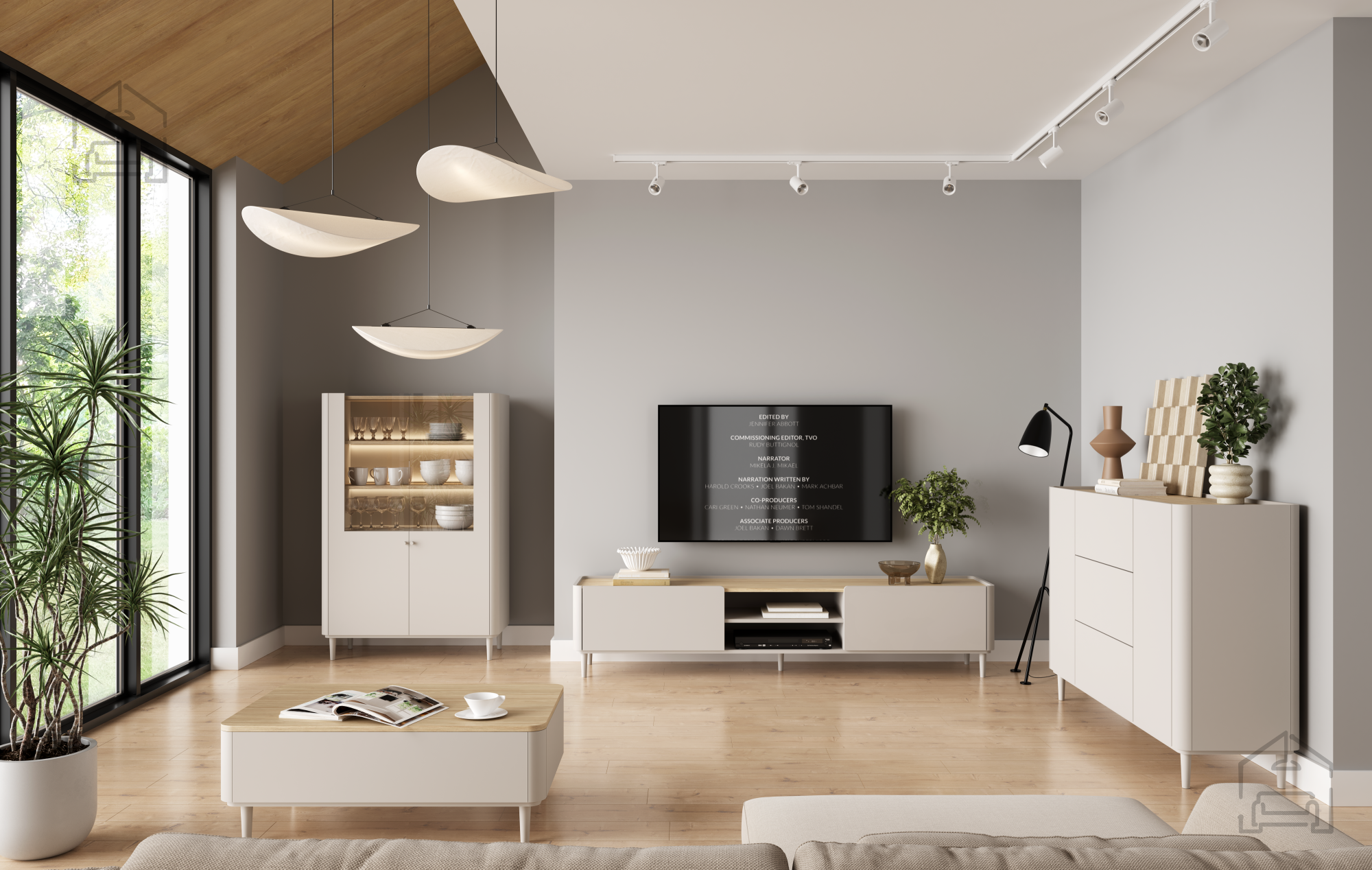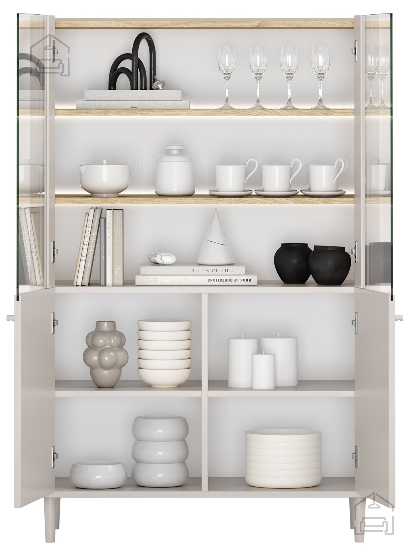 Vitrina Elivo 100 2D z nogicami se odlično ujema z notranjostmi, oblikovanimi v skandinavskem, modernem ali minimalističnem slogu. Svetli toni kašmirja in hrasta omogočajo enostavno kombiniranje z drugimi kosi pohištva ter z dodatki v toplih, naravnih barvah. Uporabite jo kot samostojen poudarek v prostoru ali kot del večje sestave s komodo, TV omarico ali jedilno mizo iz iste kolekcije. Ne glede na postavitev bo vitrina vedno izžarevala sodobno eleganco in občutek urejenosti.