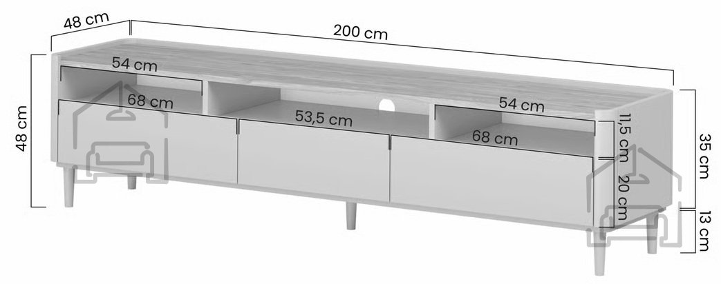 Dimenzije 200 × 48 × 48 cm omogočajo komodi, da se prilega večini dnevnih sob, bodisi kot samostojen element ali kot del večje pohištvene sestave. Višina 48 cm je idealna za udobno gledanje televizije, medtem ko globina 48 cm nudi dovolj prostora za shranjevanje. Komoda vključuje en zaprt del (1K) in dva prostorna predala (2SZ), kar omogoča organizirano shranjevanje različnih predmetov – od multimedijske opreme do osebnih dodatkov. Zaradi svoje preproste, a dodelane oblike se lahko uporablja tudi v drugih prostorih, na primer v spalnici, delovni sobi ali predsobi.