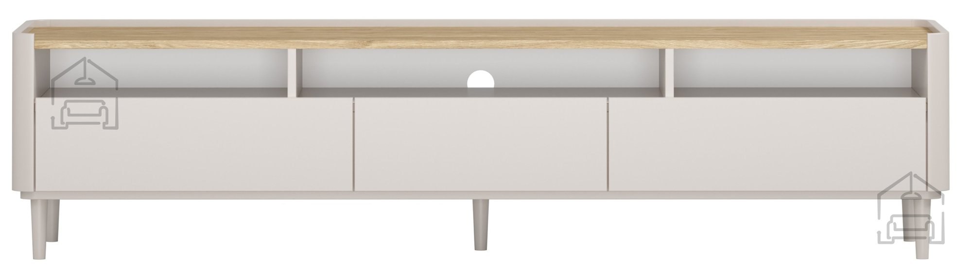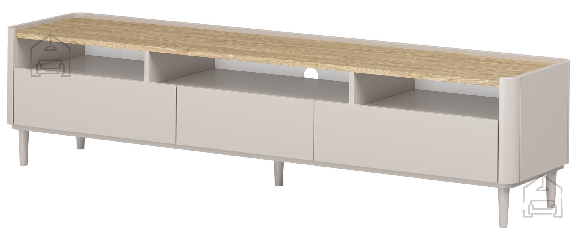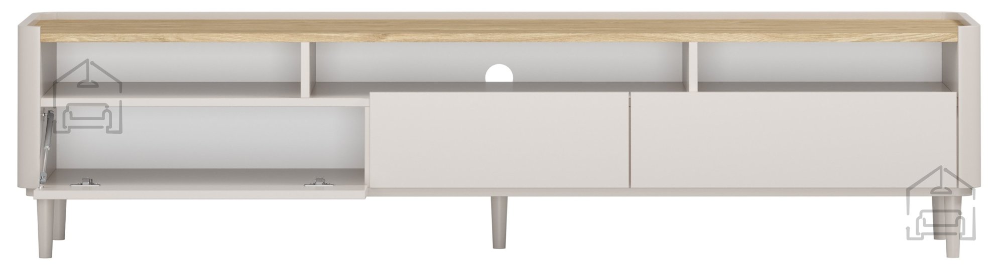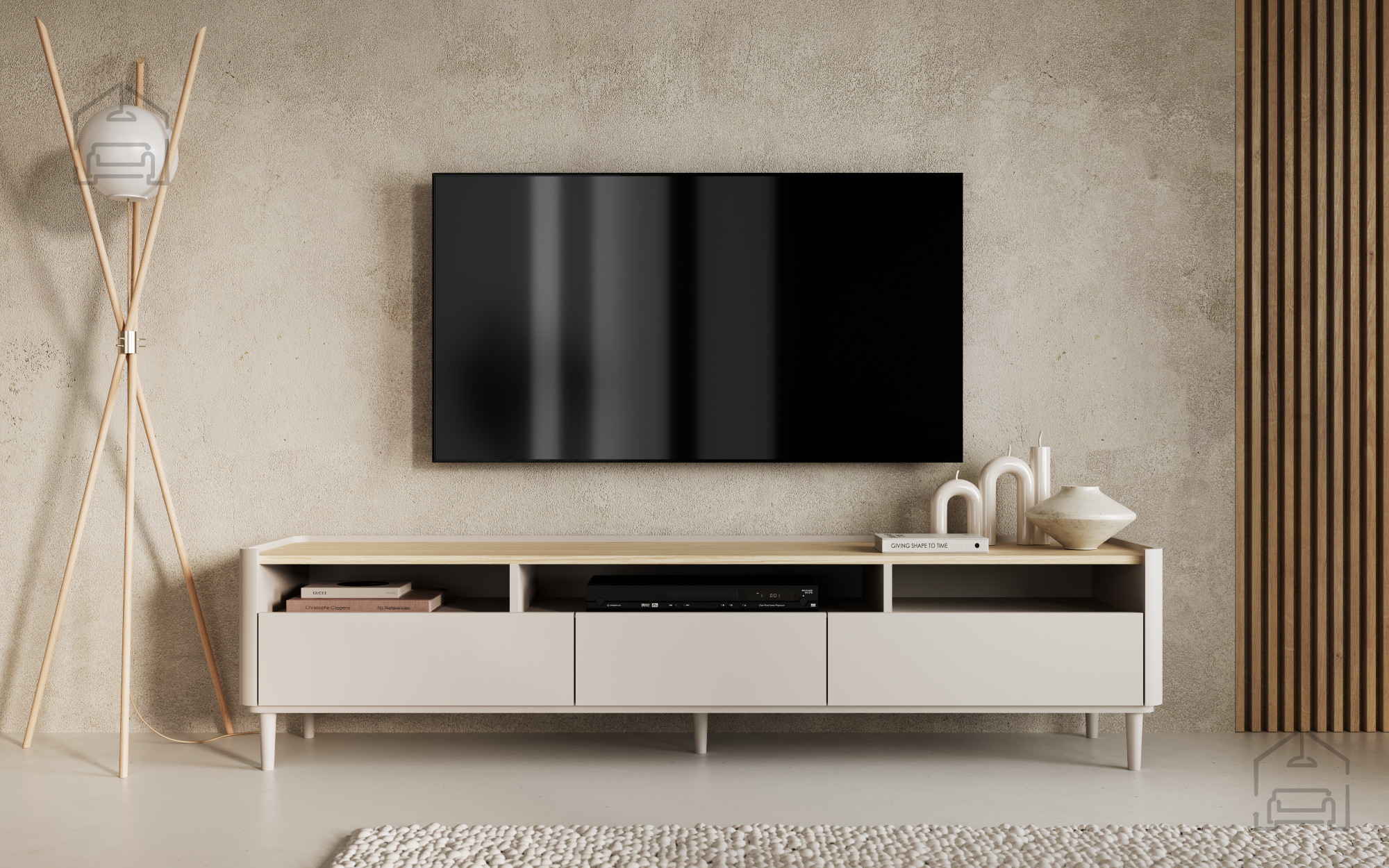 TV komoda Elivo 200 1K2SZ z nogicami – Bogart je sodoben kos pohištva, namenjen tistim, ki cenijo preprost, a dovršen dizajn in visoko funkcionalnost. Z dimenzijami 200 × 48 × 48 cm ponuja dovolj prostora za sodobne televizorje in spremljevalno opremo. Njena barvna kombinacija kašmirja in vrhnje plošče v odtenku naoljenega hrasta ustvarja topel, naraven videz, ki se odlično ujema z minimalističnimi interierji skandinavskega ali japandi sloga.