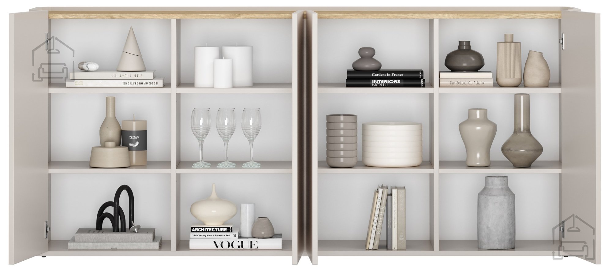 Komoda Elivo 200 4D se lepo ujema z drugimi kosi pohištva v podobnih barvnih tonih, predvsem z elementi v hrastu, belih ali peščenih odtenkih. Idealna je za postavitev ob steno dnevnega prostora, kjer lahko na zgornji ploskvi razstavite dekorativne dodatke, svetilko ali okvirje s fotografijami. Zaradi nevtralnih barv in prefinjenih materialov se komoda prilagodi različnim interierjem in slogom, ne da bi izgubila svojo unikatno identiteto.