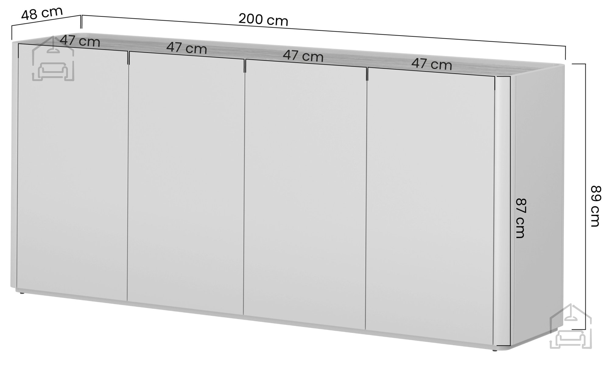 Komoda meri 200 × 48 × 89,5 cm in ponuja prostorno notranjost, ki omogoča pregledno shranjevanje. Vrata brez ročajev ustvarjajo sodoben, gladek videz, obenem pa prispevajo k preprostem vzdrževanju čistoče. Sistem mehko zapiranje preprečuje nenadno zaloputanje vrat, kar povečuje udobje uporabe in podaljšuje življenjsko dobo okovja.