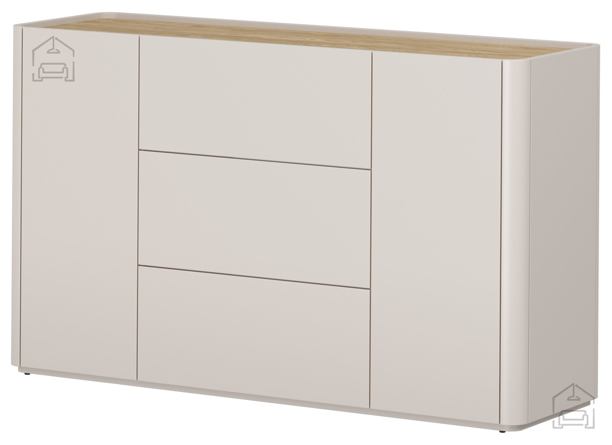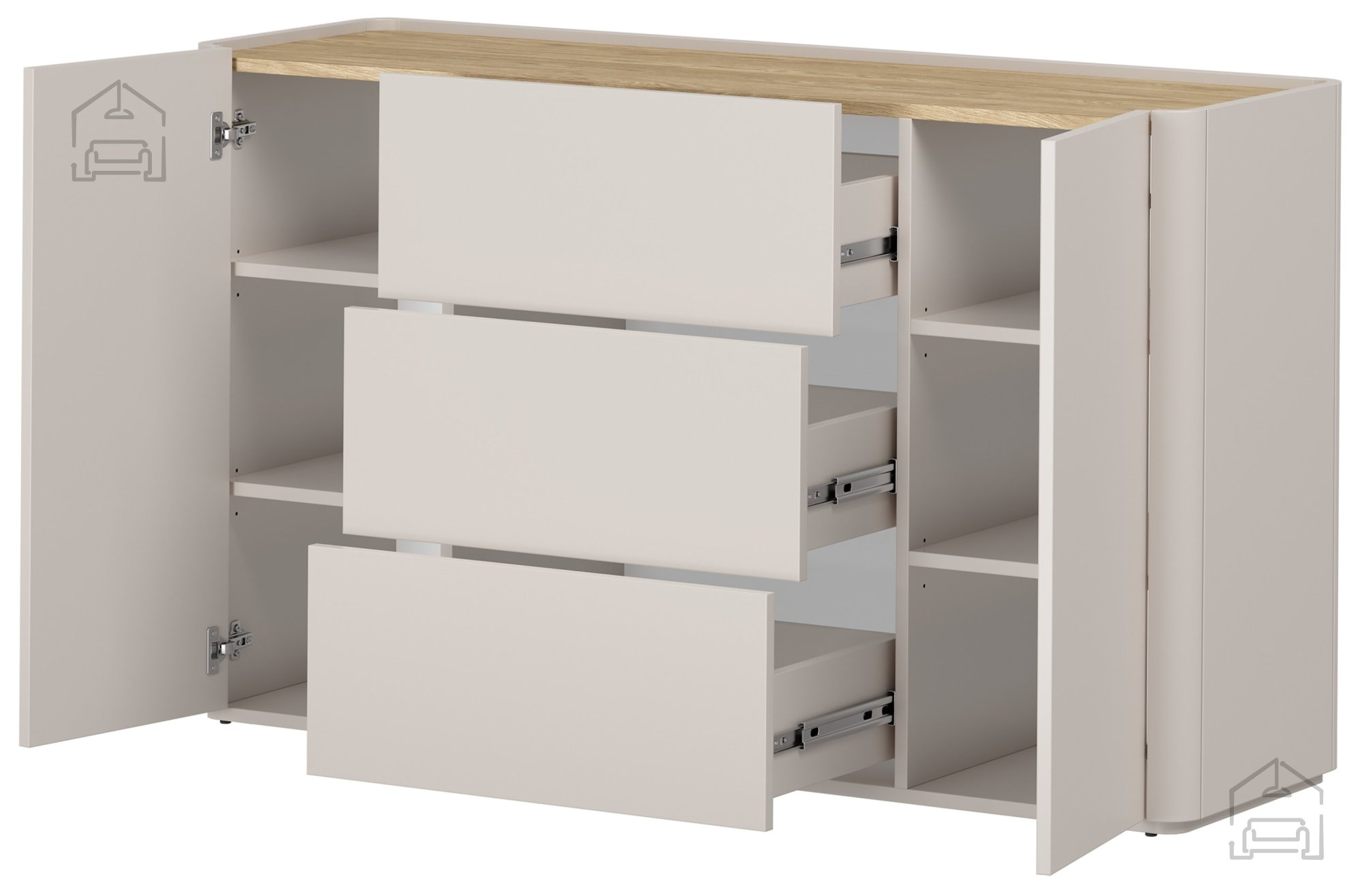 Komoda Elivo 150 2D3SZ v barvi kašmir z vrhnjo ploščo v oljenem hrastu predstavlja odlično ravnotežje med toplino lesa in subtilno eleganco sodobnega dizajna. Njene dimenzije 150 × 48 × 89,5 cm omogočajo optimalno izrabo prostora, ne glede na to, ali jo postavite v dnevno sobo, spalnico ali delovni kabinet. Gladke fronte brez ročajev poudarjajo minimalistično estetiko in ustvarjajo čiste linije, ki se lepo zlijejo z različnimi interierji. Zaradi svoje uravnotežene oblike in mehkih robov komoda deluje zračno in hkrati prefinjeno.