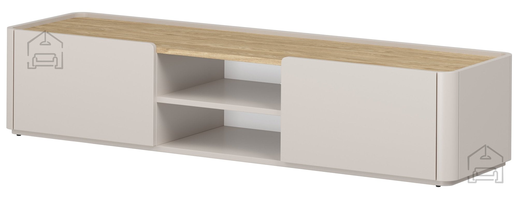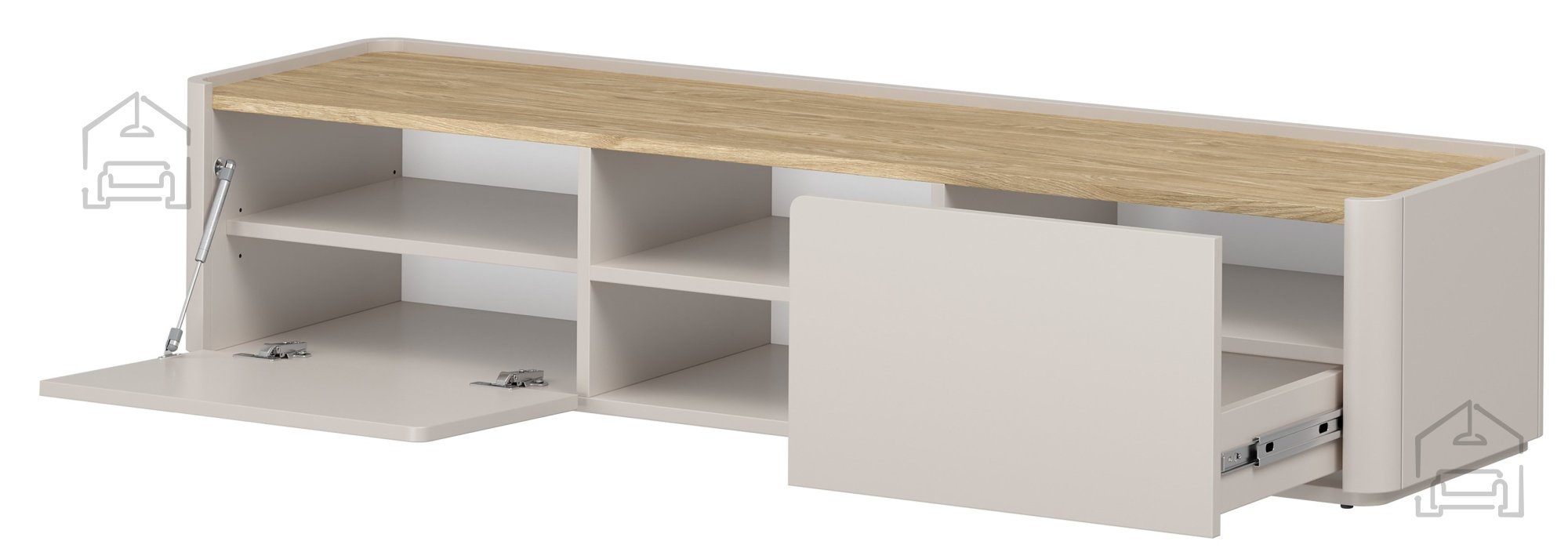 TV komoda Elivo 170 1K1SZ – Bogart je elegantna in funkcionalna rešitev za sodobne dnevne sobe. S svojo kombinacijo barve kašmir in vrhnje plošče v naoljenem hrastu prinaša toplino ter občutek ravnovesja med sodobnim dizajnom in naravno estetiko. Površina v mat izvedbi, odporna na praske, zagotavlja dolgo obstojnost in enostavno vzdrževanje, zato bo komoda tudi po več letih ohranila svoj prvotni videz.