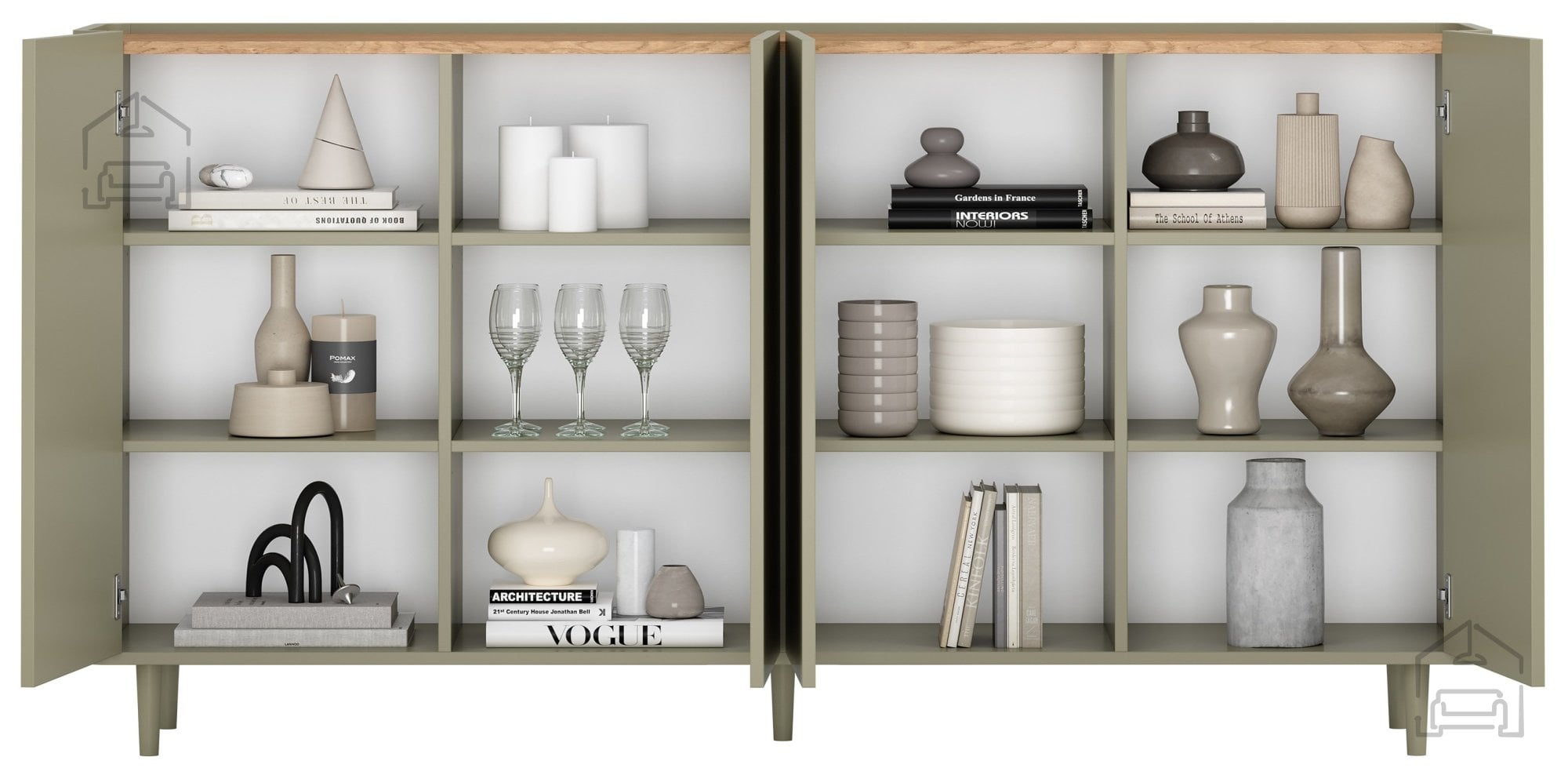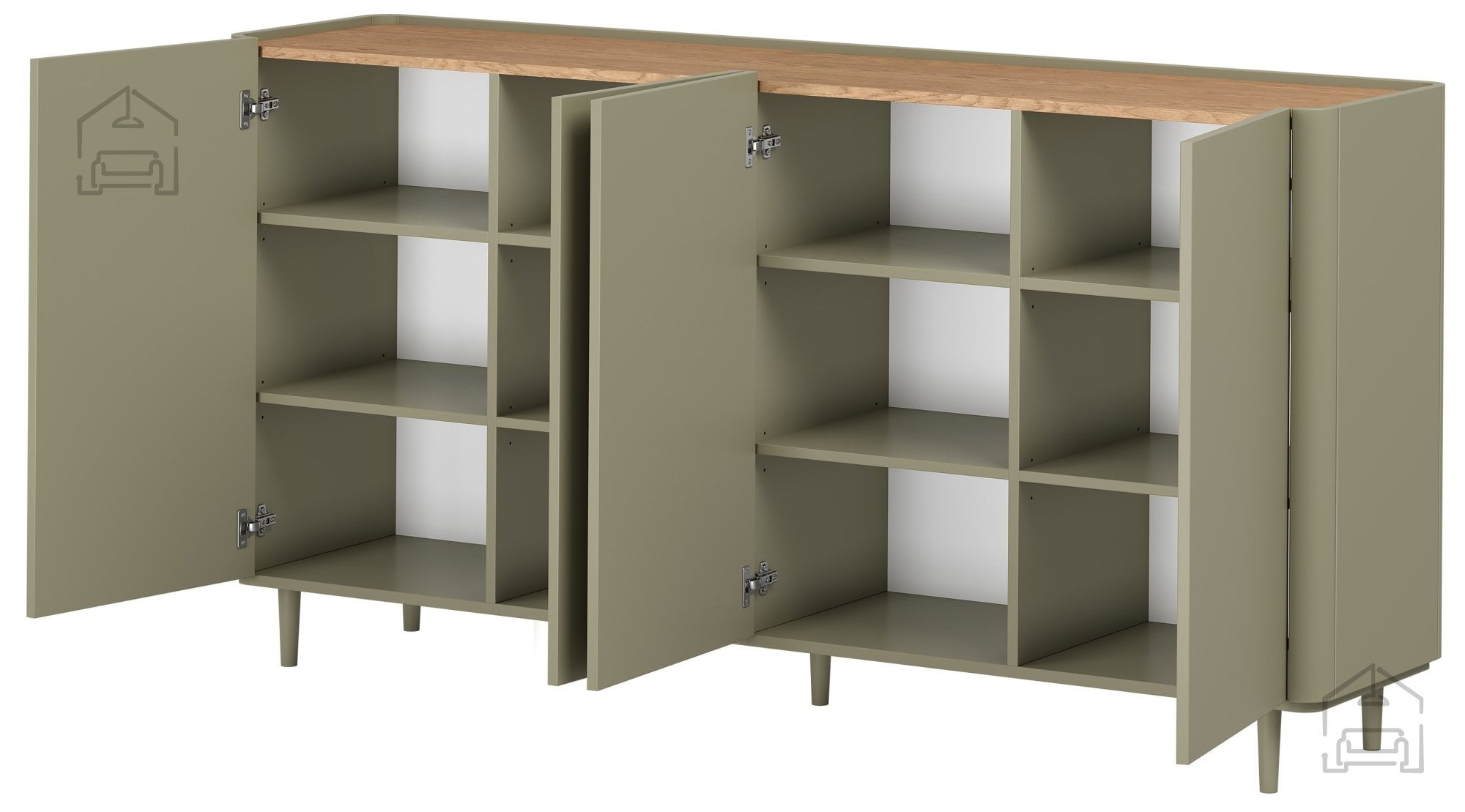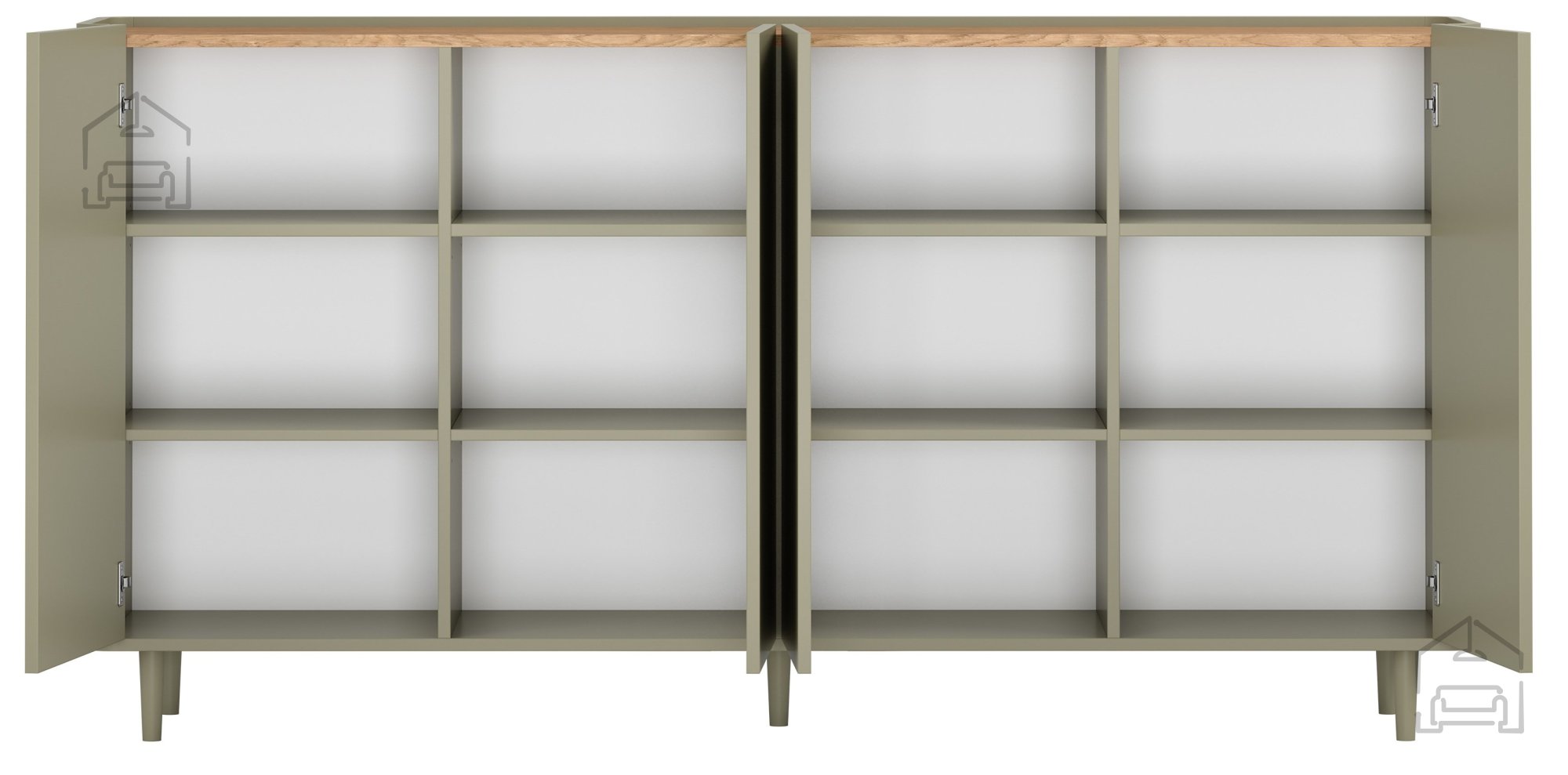 Notranjost komode je zasnovana tako, da omogoča maksimalno izkoriščenost prostora. Vključuje 12 predelkov, dve nastavljivi polici s tristopenjsko regulacijo višine ter štiri vrata. Takšna razporeditev omogoča prilagodljivo shranjevanje različnih predmetov – od dokumentov in tekstila do posode ali dekorativnih dodatkov. Zaradi premišljene zasnove je komoda primerna za uporabo v dnevni sobi, jedilnici, pisarni ali spalnici.